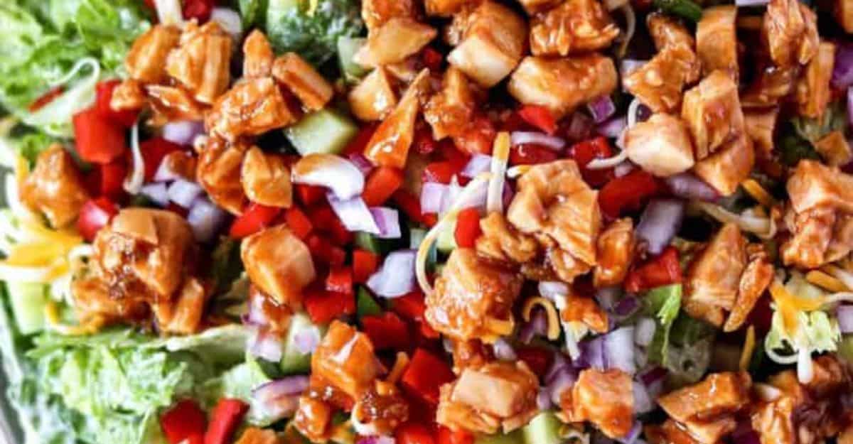 This is a quick-to-prepare dish your family will enjoy. Hot honey chicken salad is a fresh romaine lettuce with ranch dressing, and topped up with fresh veggies and a touch of cheddar cheese.