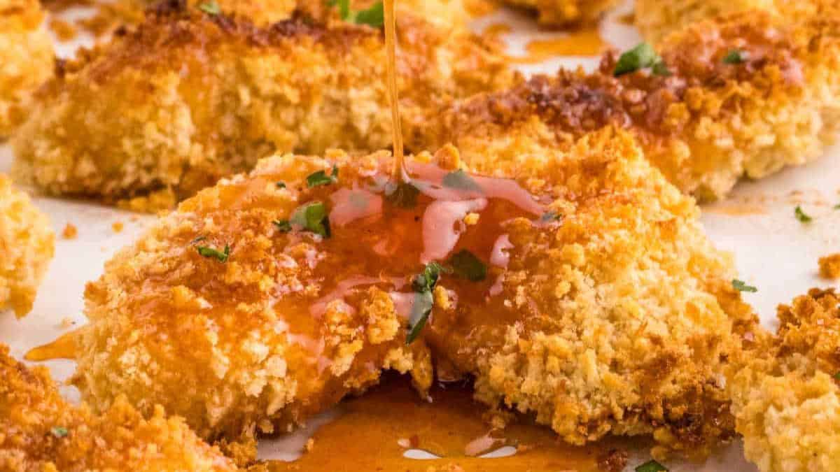 Hot chicken tenders are coated with breadcrumbs before a topping of hot honey sauce is generously applied. They are then baked to lock in the flavor, making them excellent tailgating recipes.