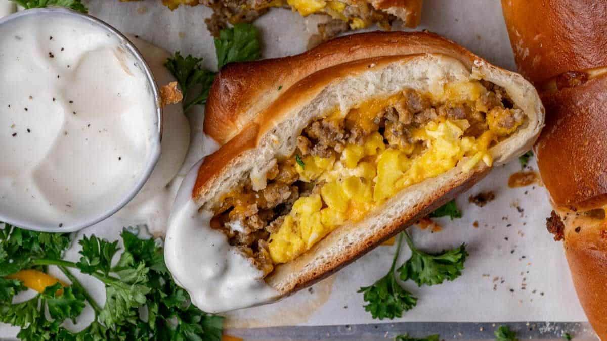 This breakfast stromboli is made with fluffy egg, sausage and cheese all baked in a braided bread. This is the perfect breakfast or brunch recipe to feed a crowd.