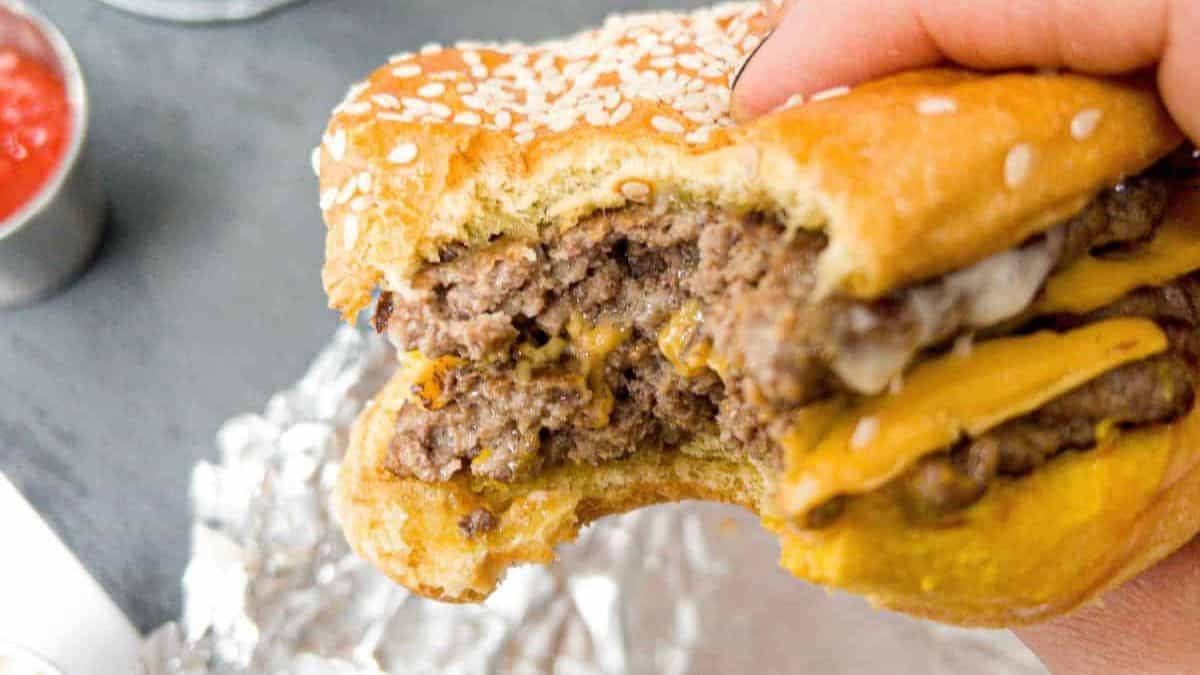 Make this Five Guys Copycat Burger which tastes just like the real thing! Melted gooey cheese is placed between two beef patties on the famous soft sesame bun. I’ll also let you into the secret of making it taste just like a real Five Guys burger!
