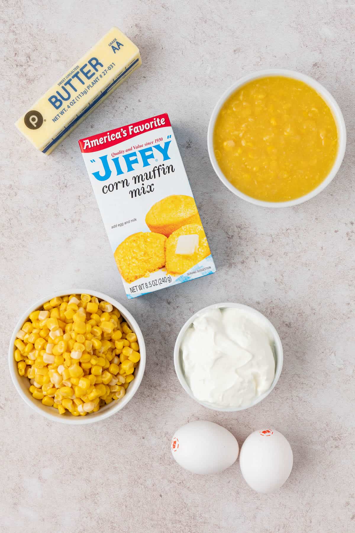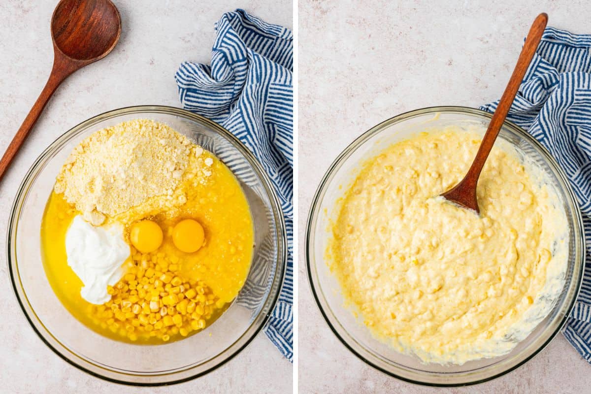 Melt the butter in a large mixing bowl and allow it to cool slightly. Once the butter has cooled slightly, add the Jiffy corn muffin mix, creamed corn, drained whole corn, sour cream, and egg to the melted butter.