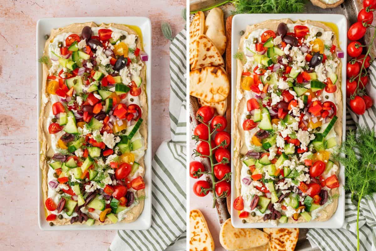 You can prep all your toppings up to a day in advance. Chop the vegetables, crumble the feta, and have everything ready to go in small containers in the fridge. When you're ready to serve, just assemble the dip. I'd hold off on building the whole thing until closer to serving time so the veggies stay crisp and fresh.