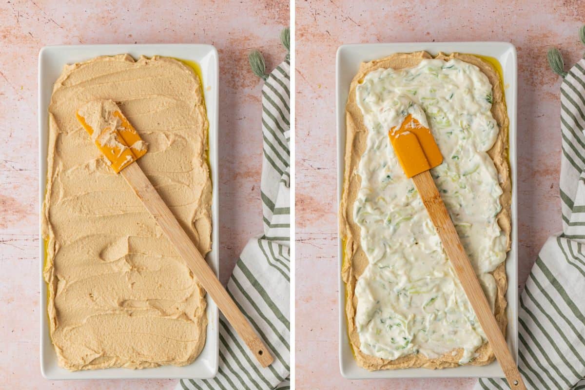 Using spatula, spread the hummus in a smooth, even layer across your serving platter. Spoon tzatziki on top and spread it gently over the hummus.