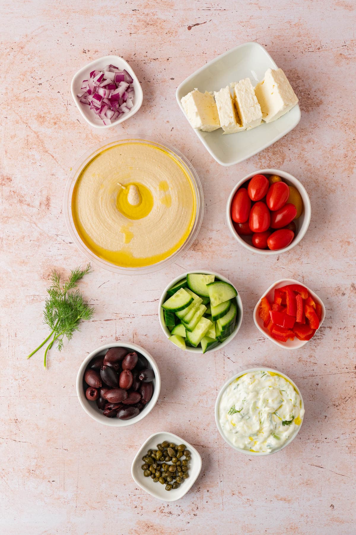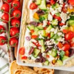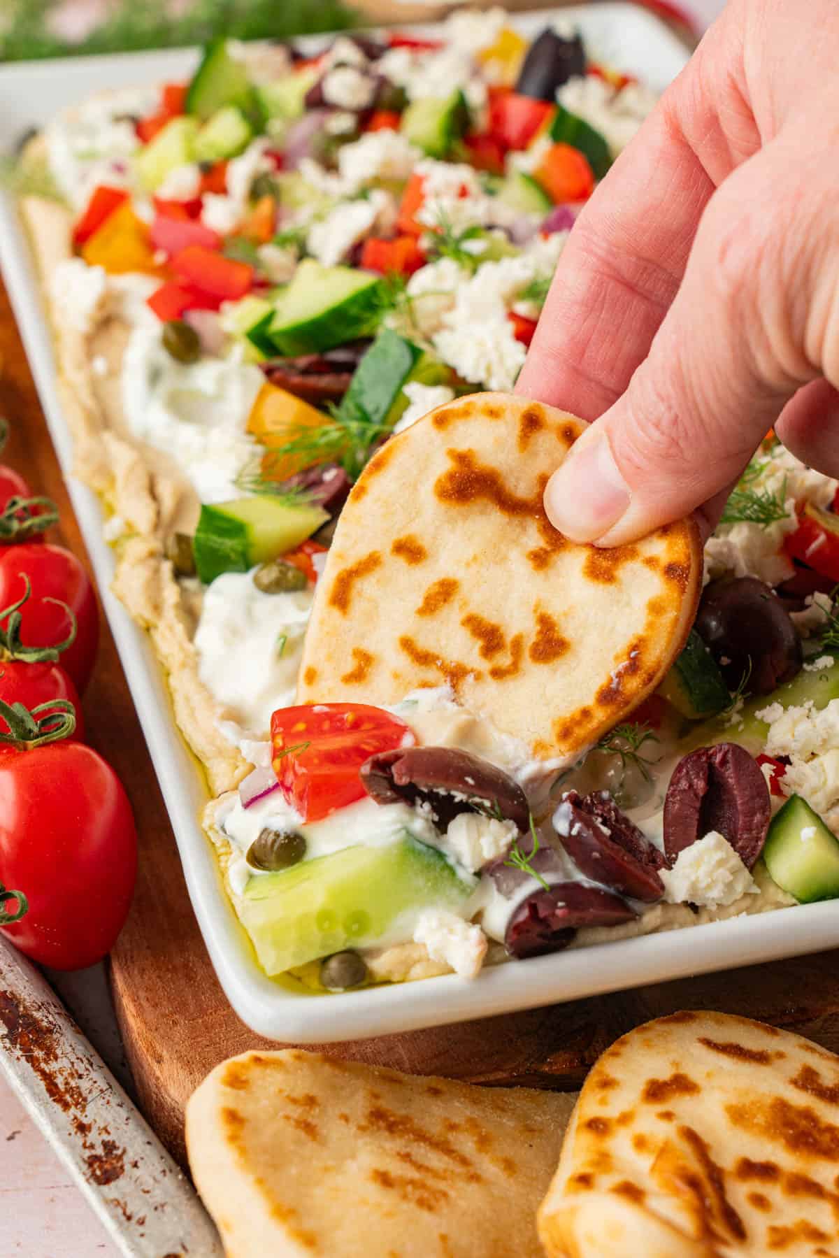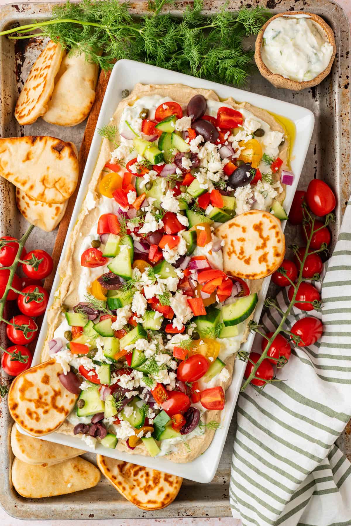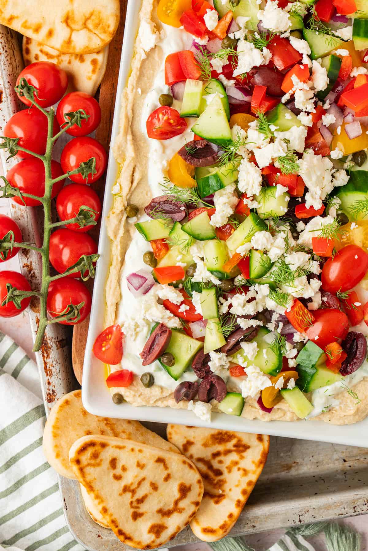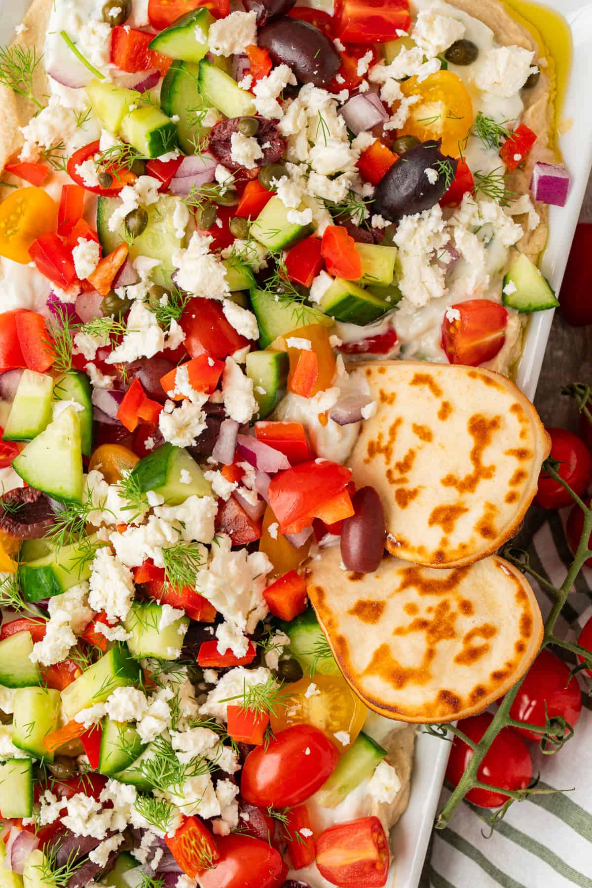 - Sprinkle the tomatoes, cucumbers, olives, peppers, onion, feta, capers and dill over the dip.