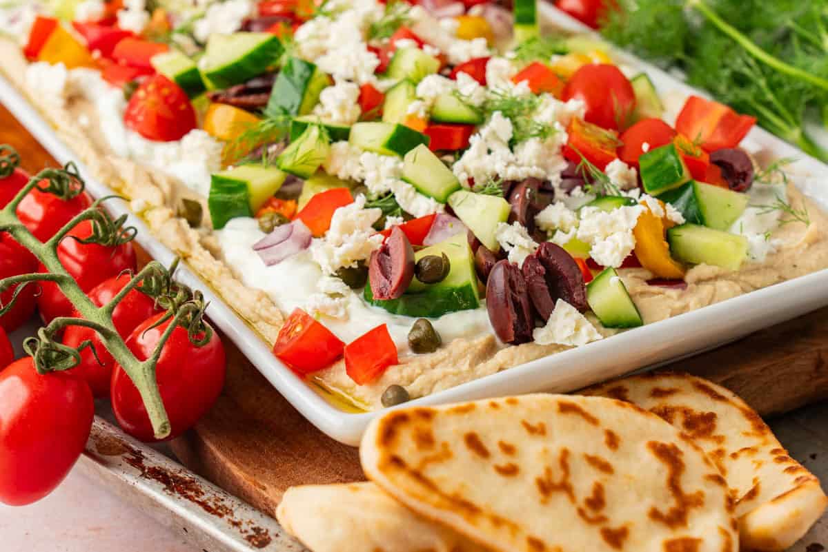 Loaded hummus dip is the perfect way to bring bold Mediterranean flavors to your table. Topped with feta, crisp cucumbers, juicy tomatoes, and briny olives, it turns a simple hummus base into something special. Greek food is all about vibrant color, fresh textures, and zesty flavor, and this dish delivers it all. Serve it with pita chips and a side of tzatziki for an easy, crowd-pleasing spread.