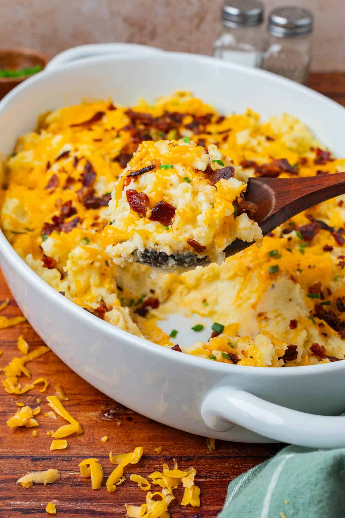 - To make an extra creamy loaded mashed potato casserole recipe, add more cheese.