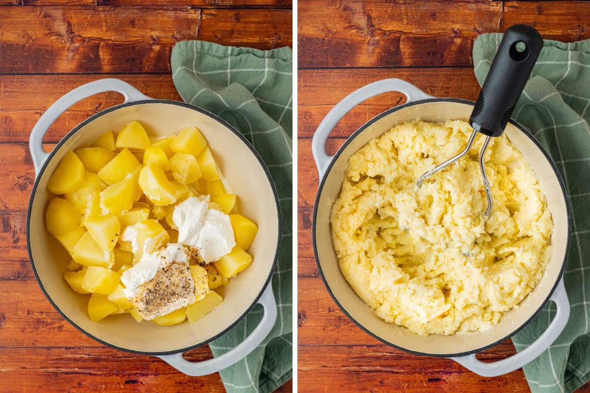 - To help blend everything smoothly, use warm potatoes for mashing. And make sure the butter and cream cheese are softened to room temperature.