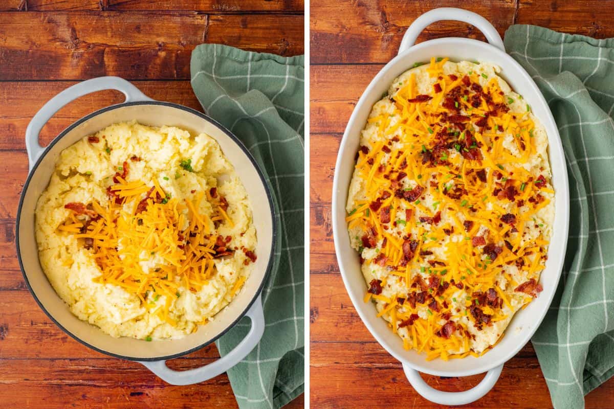 - Once the potatoes are mashed add half of the cheddar cheese, half of the bacon and half of the chives. Stir to combine. Spread the potato mixture into a 9x13 casserole dish.