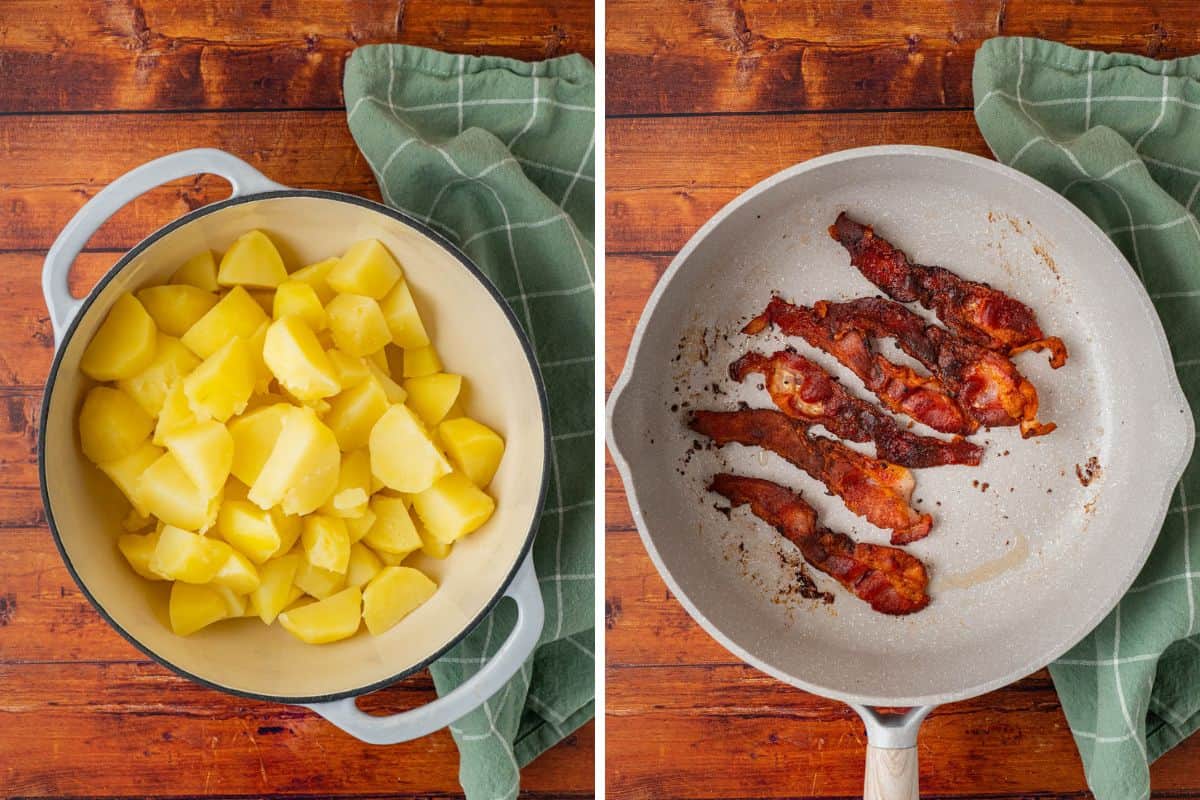 While the potatoes cook, crisp up your bacon in a skillet or bake it in the oven. Once cool, crumble it into small pieces.
