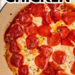 - Take the skillet and place under the broiler for 2-3 minutes, watching closely. The pizza chicken is ready when the cheese is bubbuly and melted and the pepperoni start to crisp around the edges. Remove from oven and garnish with red pepper flakes, parsley and basil.