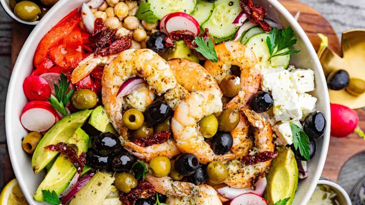 This salad is loaded with fresh veggies, shrimp and drizzled with a delicious lemony dressing for a taste of the Mediterranean. This salad is perfect for lunch or dinner.