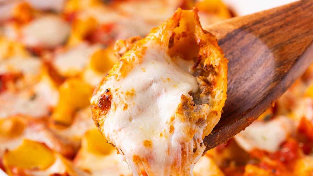 This easy Italian dinner has all of the flavors you love made with simple ingredients. The melty cheese is perfect with the beefy tomato sauce and tender pasta.