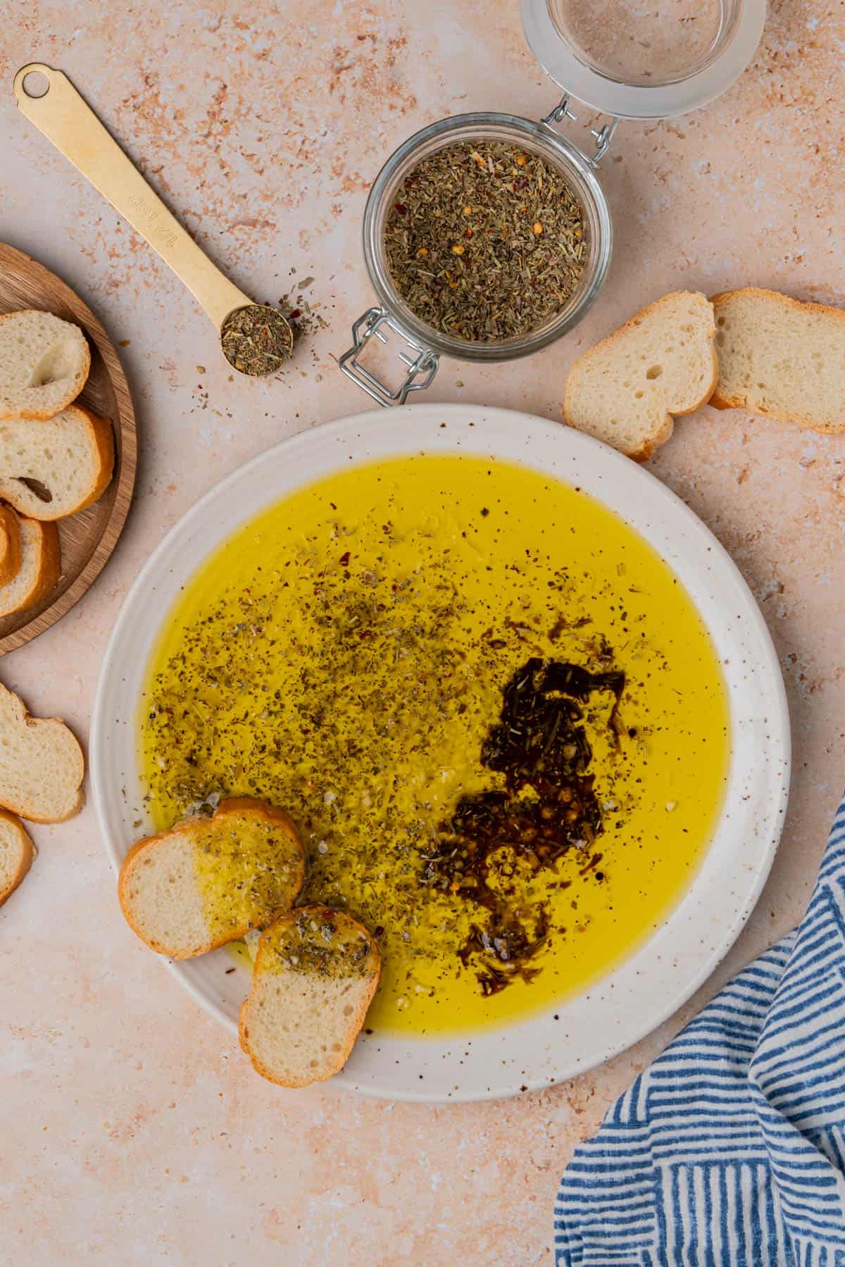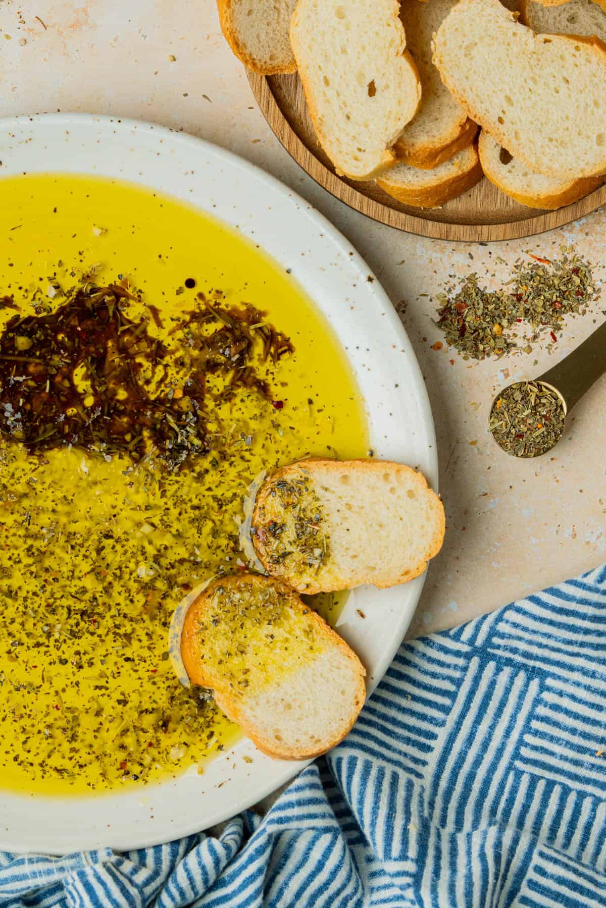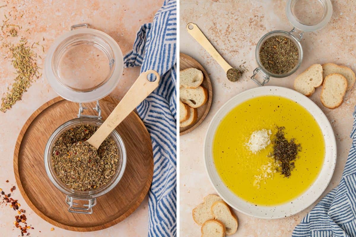 - Add a ½ cup of olive oil to a shallow bowl or rimmed plate. Add ½-1 teaspoons spice blend along with other additions as desired. Serve with crusty baguette or Italian bread for dipping.
