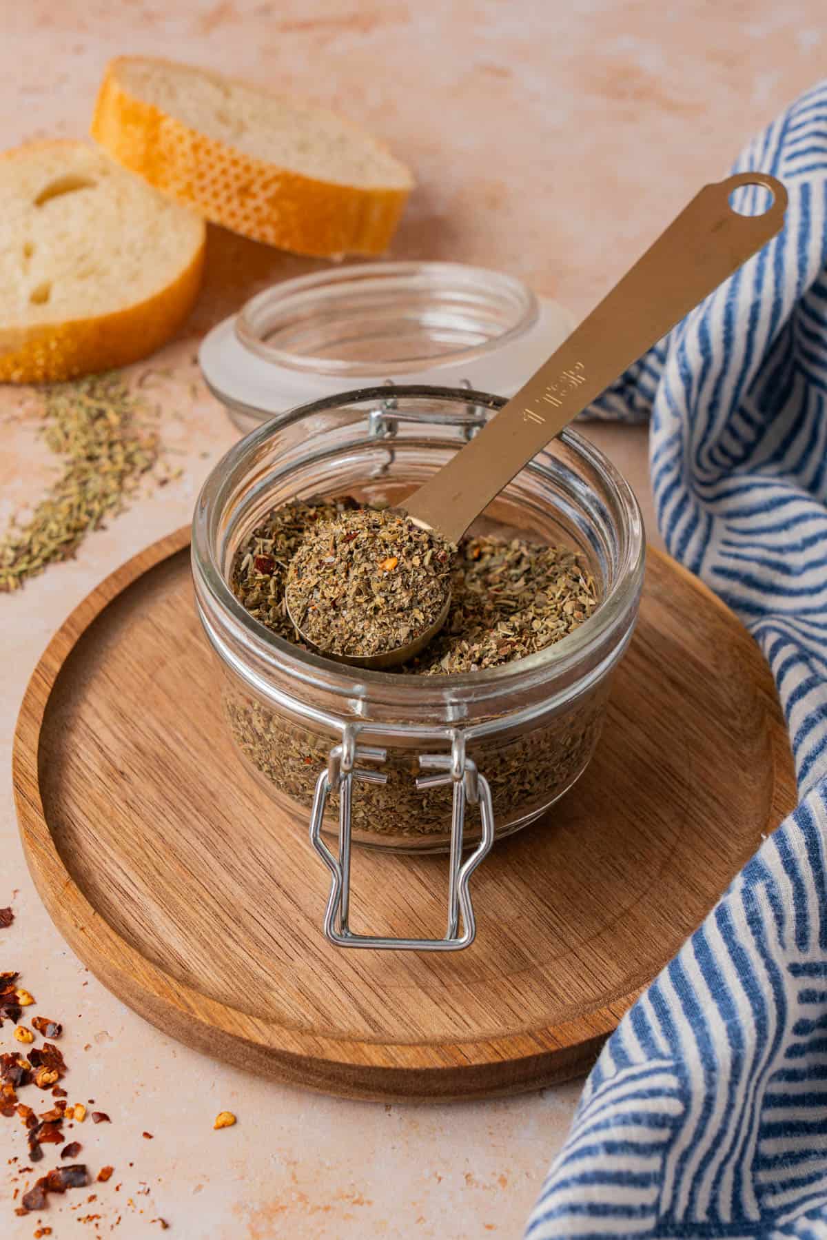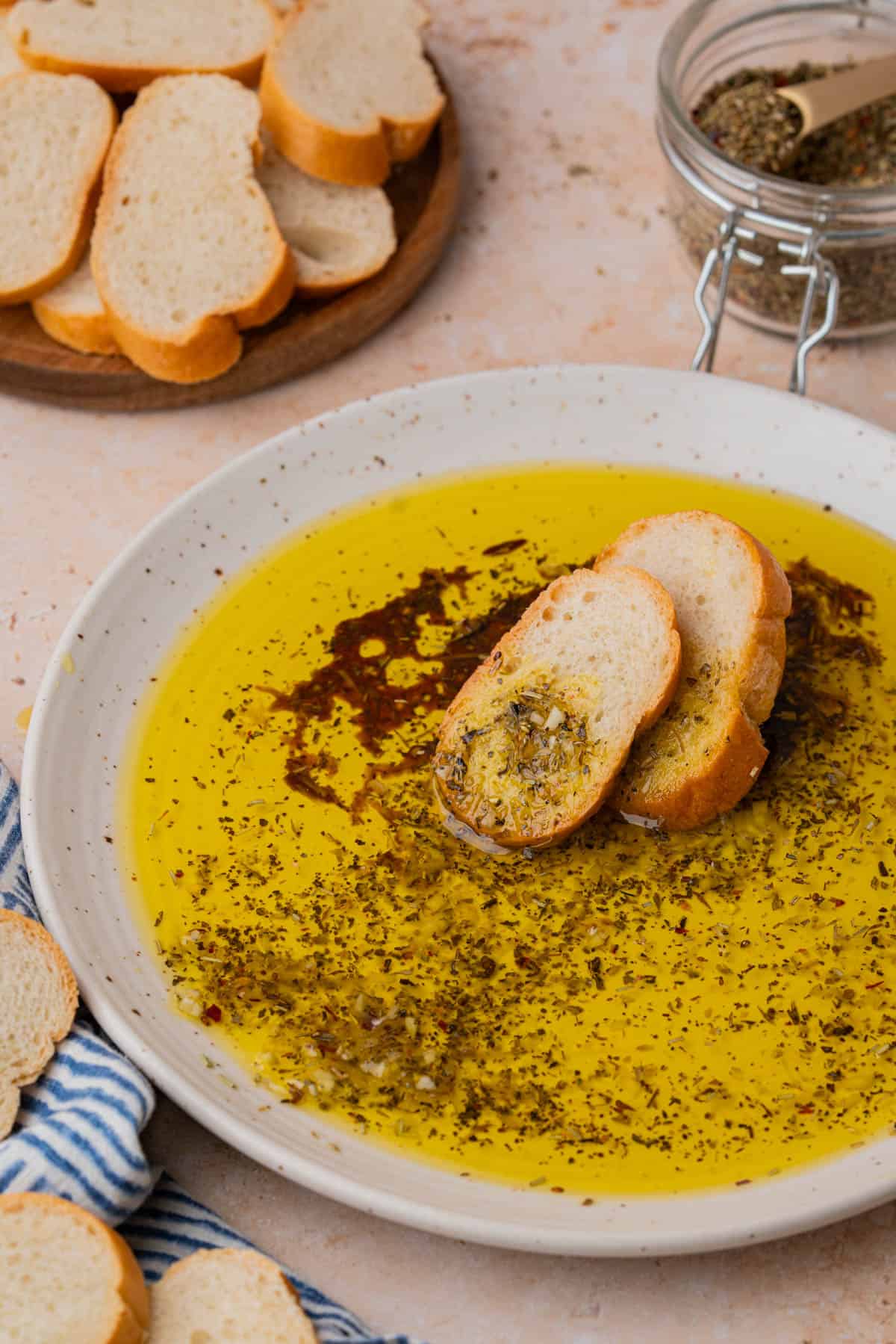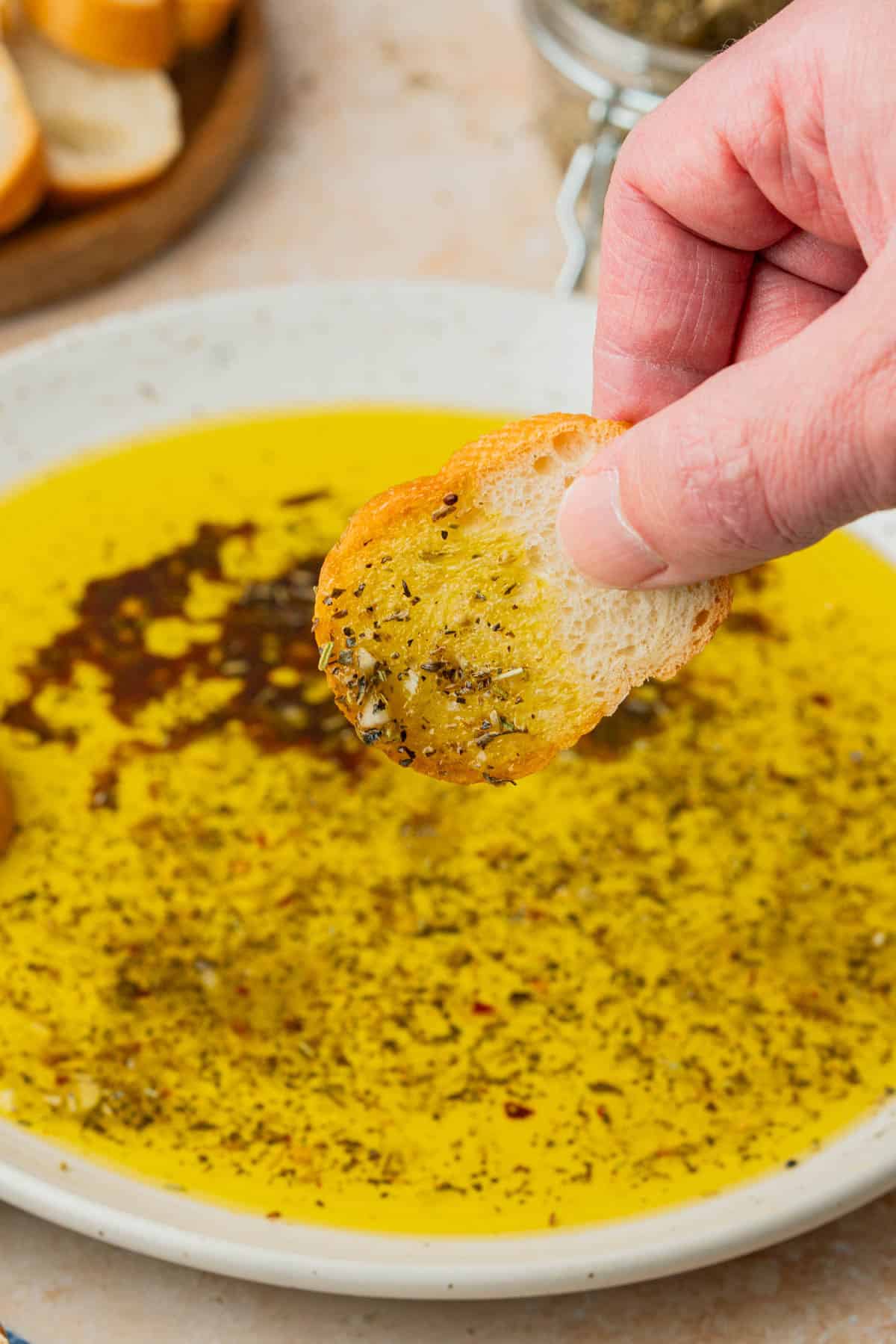 - Add a ½ cup of olive oil to a shallow bowl or rimmed plate. Add ½-1 teaspoons spice blend along with other additions as desired. Serve with crusty baguette or Italian bread for dipping.