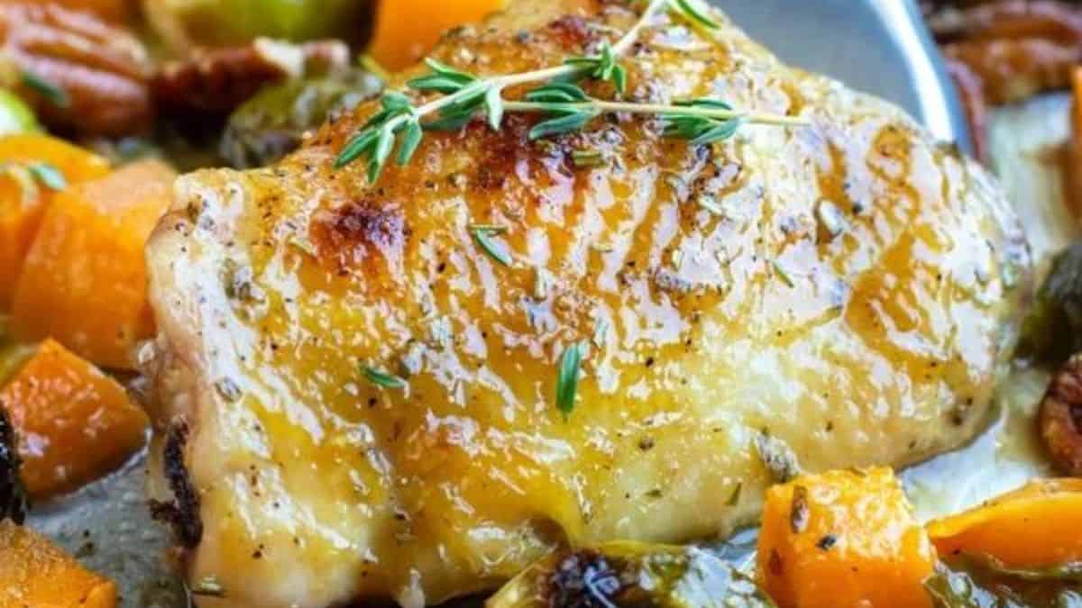Tender, juicy chicken thighs are coated in a glaze with Dijon mustard and maple syrup. Fresh herbs add an extra touch, while roasted Brussels sprouts and butternut squash complete this flavorful one-pan wonder. It's perfect for a hassle-free weeknight dinner that's both delicious and nutritious.