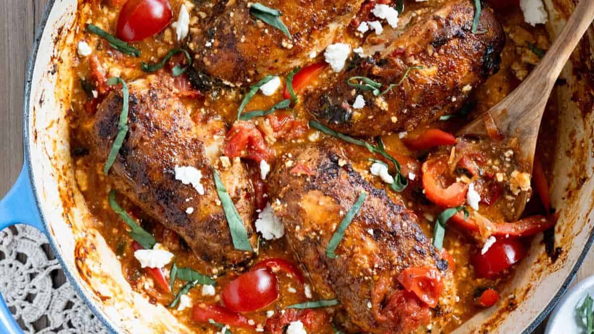 This flavorful Harissa Baked Chicken With Feta is a Mediterranean inspired recipe that has a spicy kick from harissa paste. The chicken is cooked in the oven until perfectly tender and juicy.