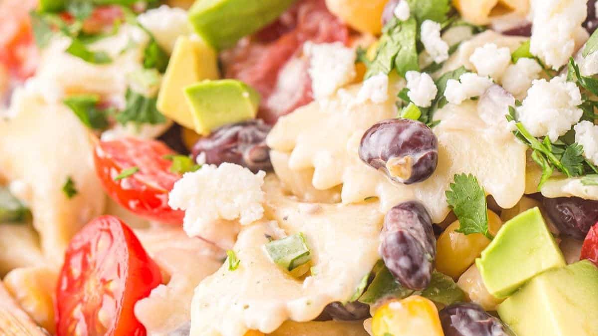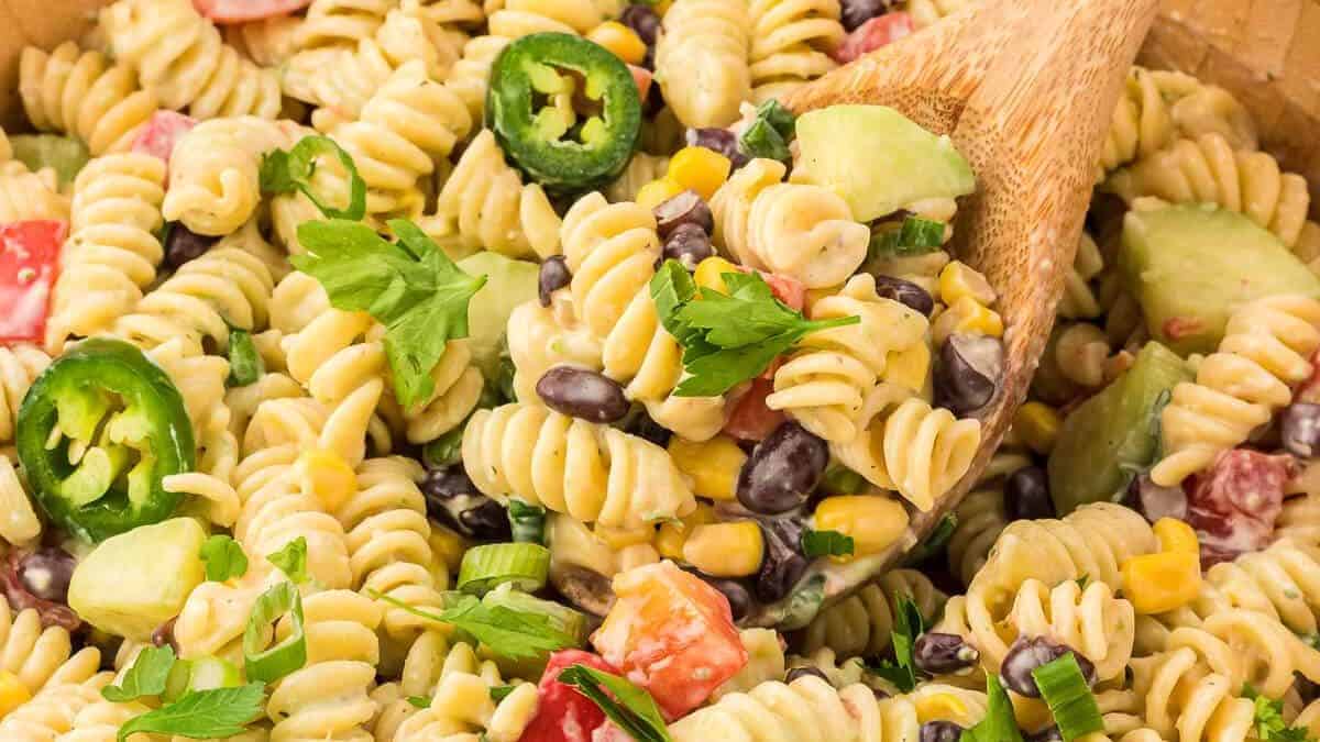 This pasta salad is loaded with black beans and corn for a southwestern flavor and then coated with a creamy ranch dressing that has a extra kick from jalapeno.