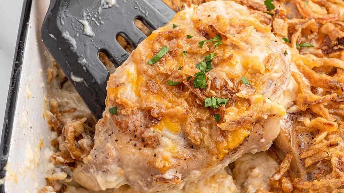 This pork chop casserole is a crowd-pleaser. Tender pork chops are baked on potatoes, onions, and in a savory cream sauce, then topped with cheese. Yum!