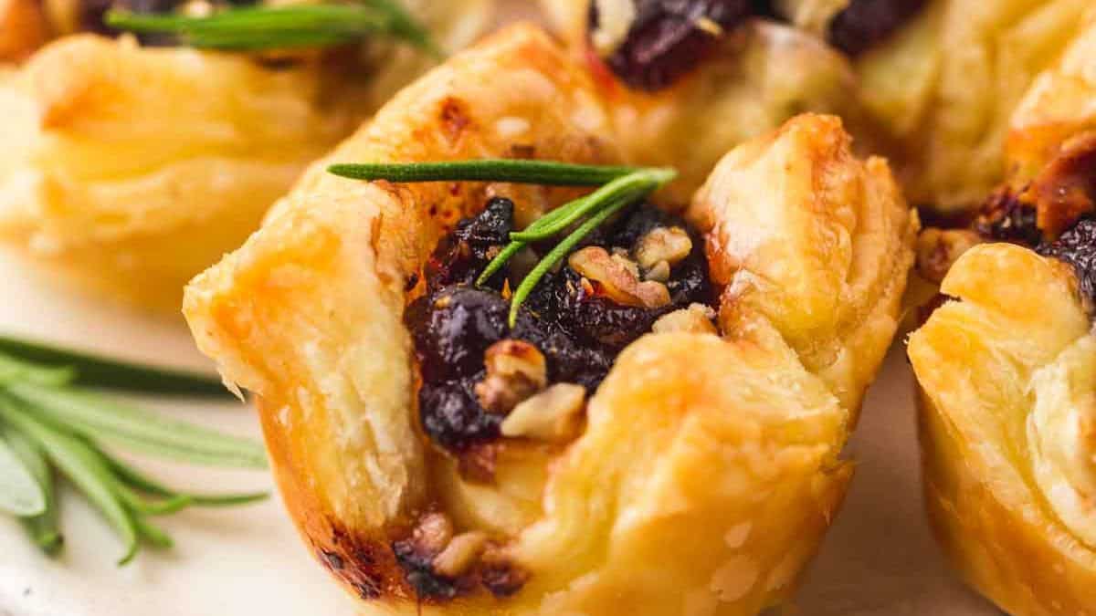 These Cranberry Brie Bites are an ideal appetizer. Gooey melty cheese with tart cranberry sauce wrapped in golden, buttery, and flaky puff pastry cups. Perfect for your next holiday gathering!