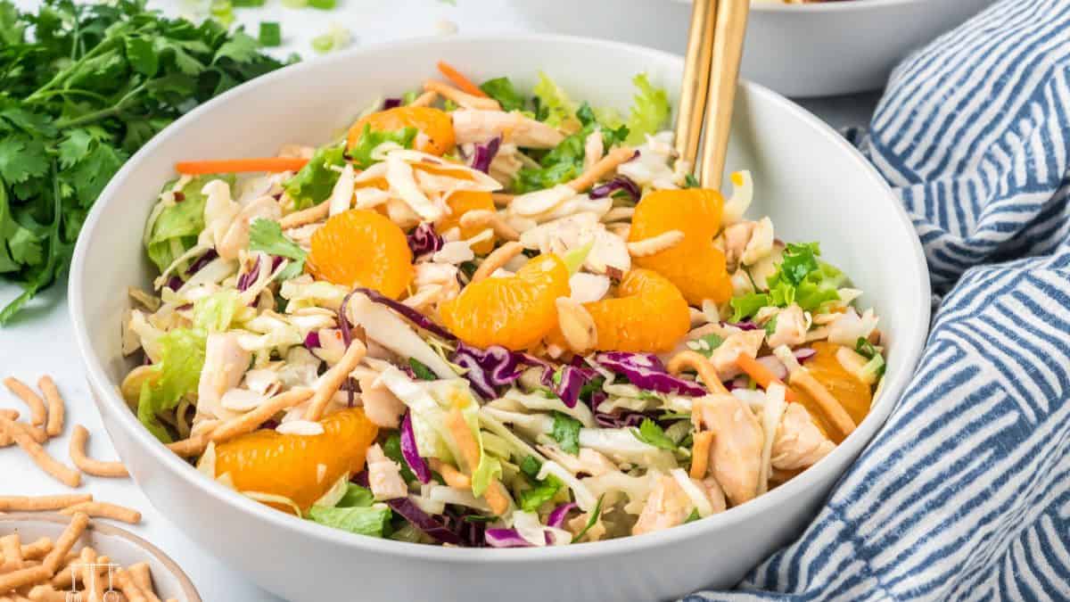 This Asian Chicken Salad is made with shredded rotisserie chicken to make dinner prep quick. This salad is also great for lunches as long as you keep the dressing separate.
