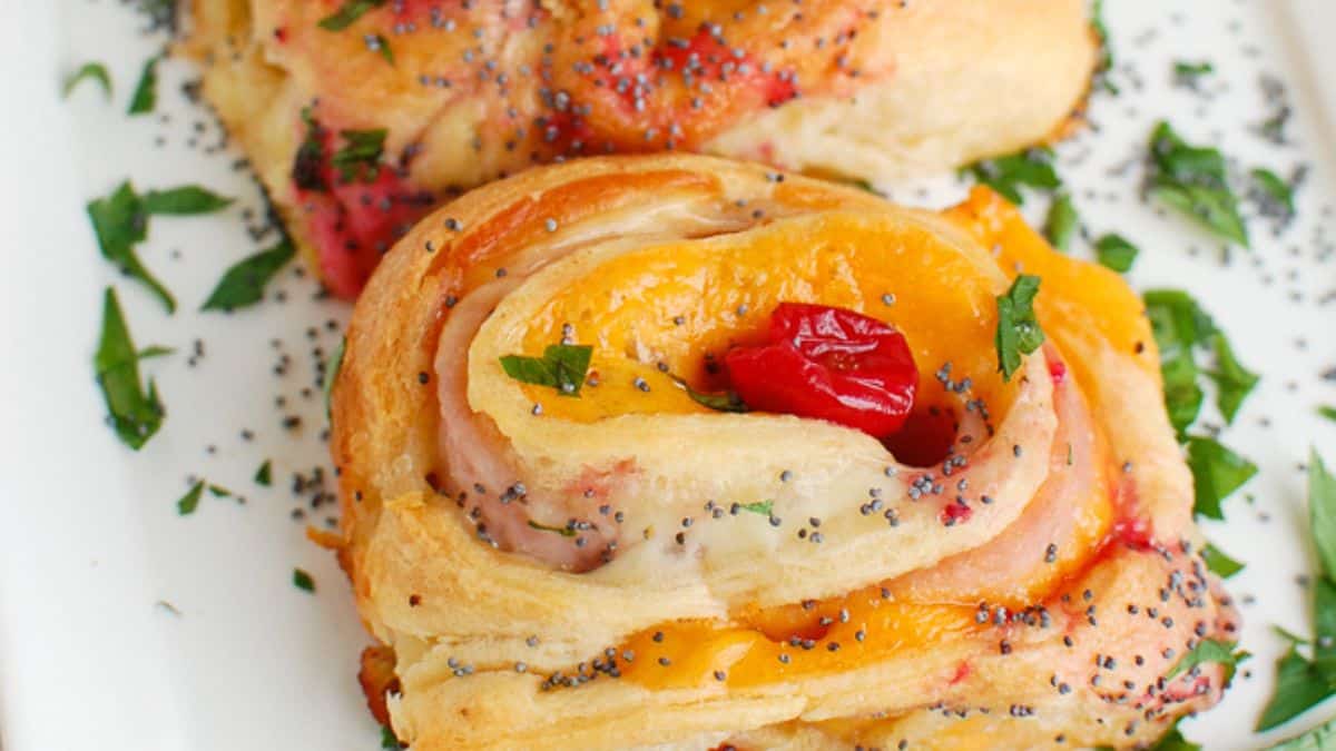 These delicious ham and cheese rollups are a fun and festive holiday appetizer. The ham, cheese and cranberry is rolled in a flaky crescent roll dough and baked until golden brown.