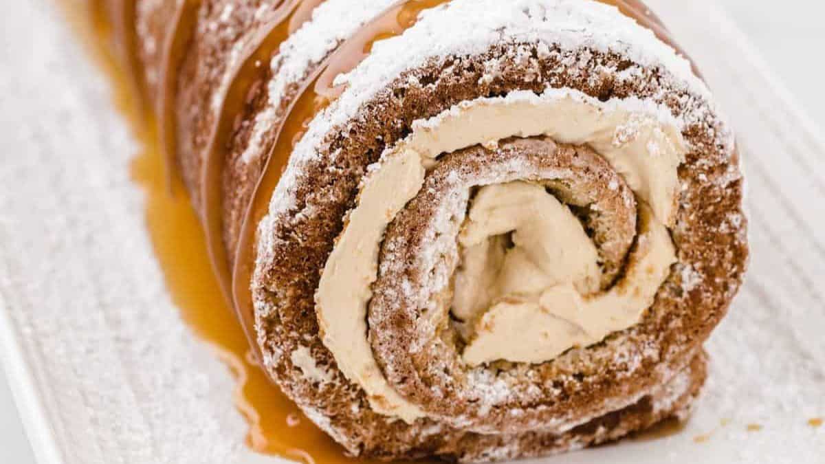 This banana cake roll is moist and delicious with a sweet cream cheese filling and a homemade caramel drizzle. This cake is a great way to use up ripe bananas.