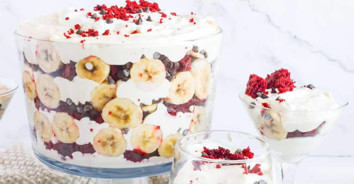 This pudding has chunks of red velvet cake, mini crushed chocolate chips, sliced banana pieces, and layers of vanilla ice cream frosting. It is a simple, straightforward, and flavorful recipe.