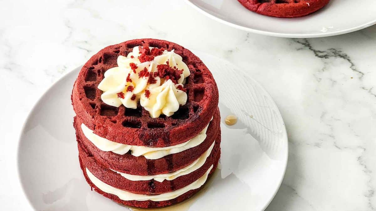 Get the recipe: Red Velvet Cake Mix Waffles with Cream Cheese Frosting