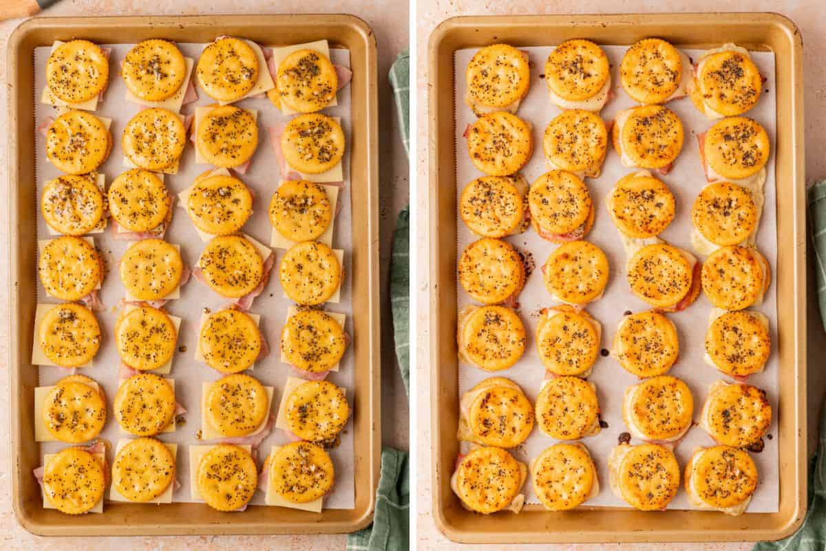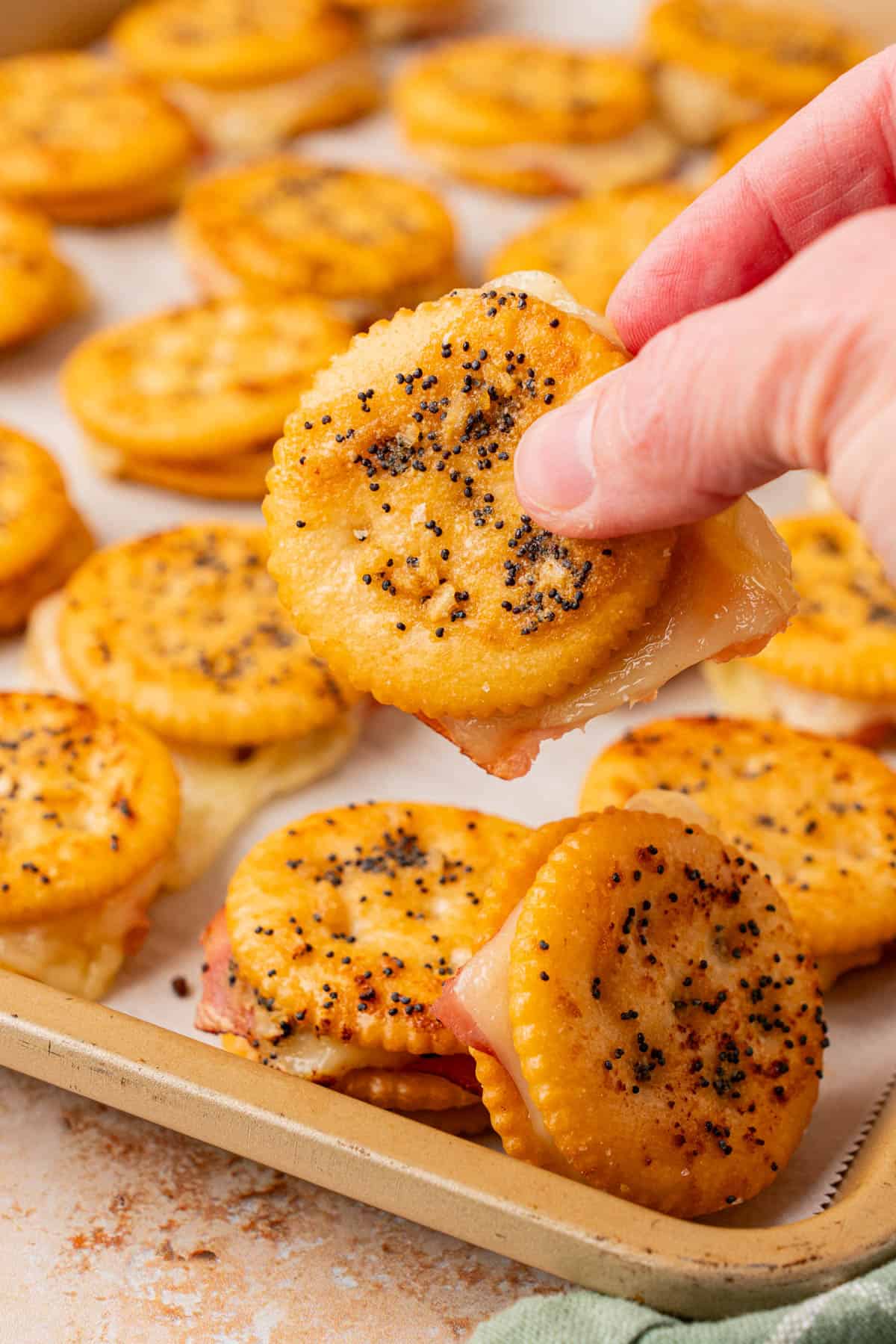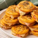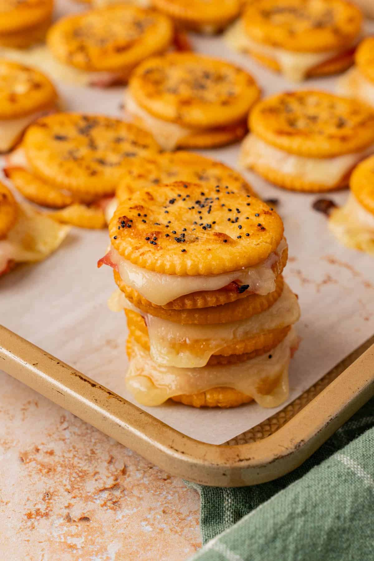 These easy Ritz cracker sandwiches have the perfect balance between savory, slightly sweet, and buttery. They are baked just long enough for the cheese to melt and the crackers to turn golden, making them even more irresistible straight from the oven.