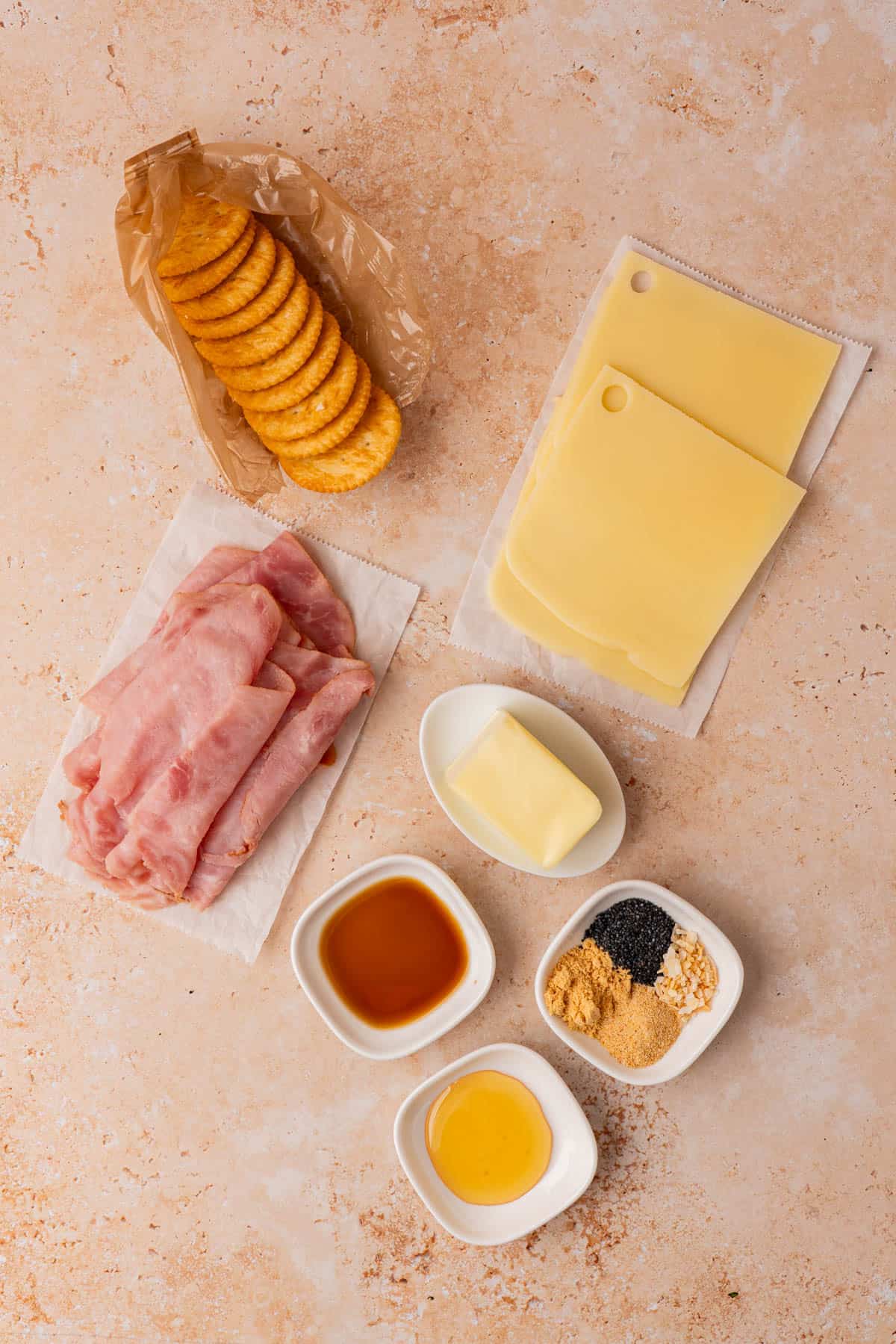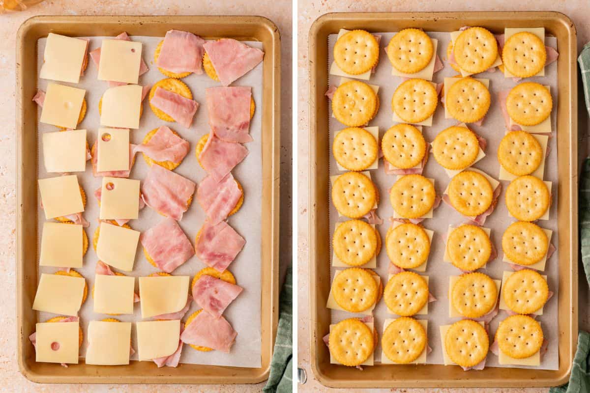- Top the crackers with a piece of ham followed by a piece of cheese. Add the remaining Ritz crackers to form the top of the sandwiches.