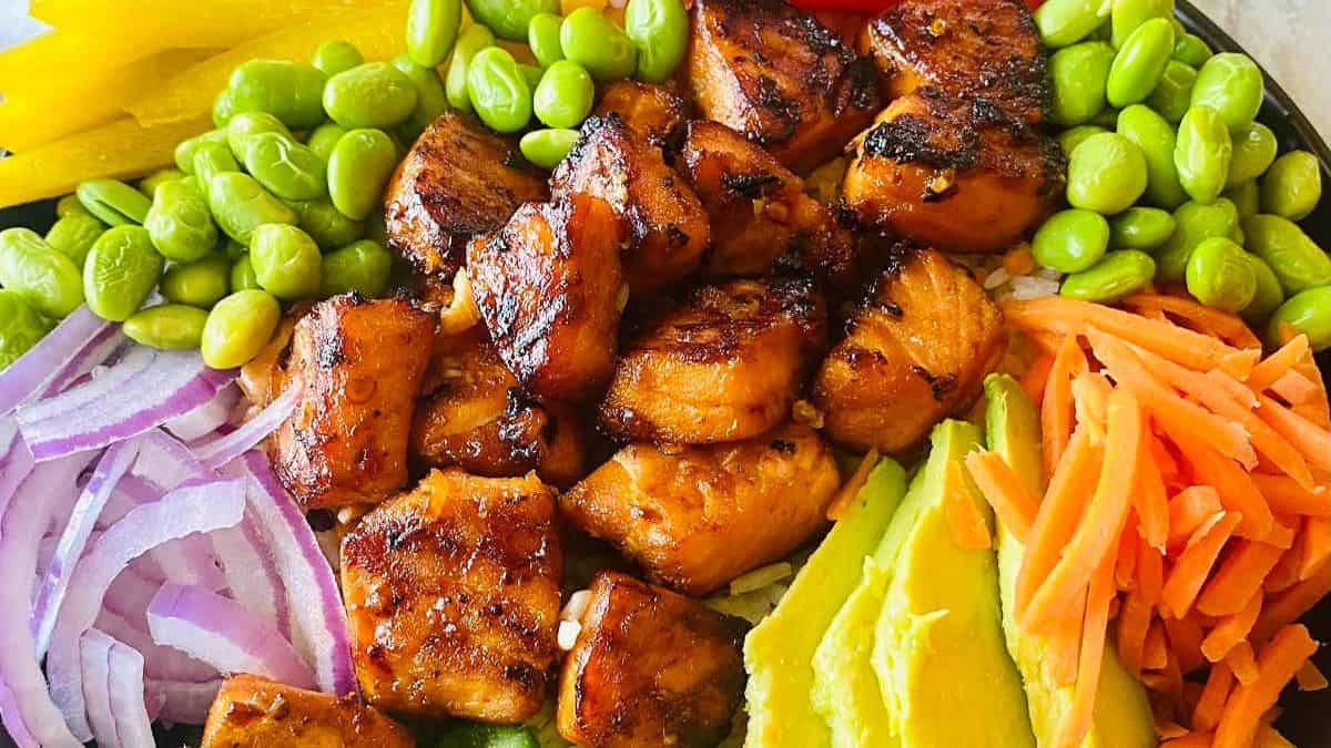 Spice up your weeknight dinner with these air fried teriyaki salmon bites! They have a sweet crispy outside with a soft flaky inside and are cooked in no time in the air fryer. Placed on top of a bed of brown rice with edamame and avocado and drizzled in a creamy spicy yogurt sauce, they're sure to be a dish the whole family will love!