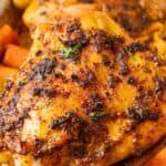Set the pan into the oven and bake for 40 to 45 minutes or until the chicken reaches an internal temperature of 175°F and the potatoes and carrots are fork-tender.