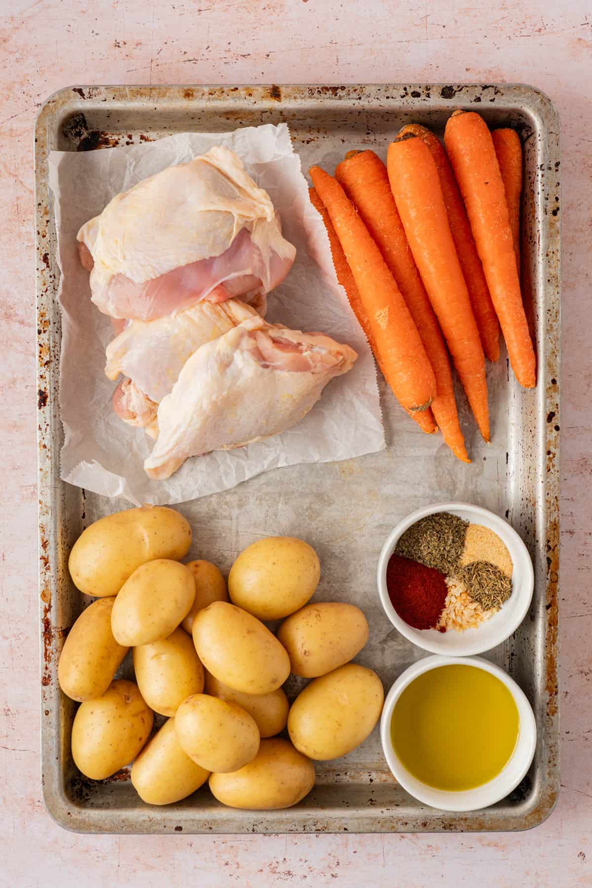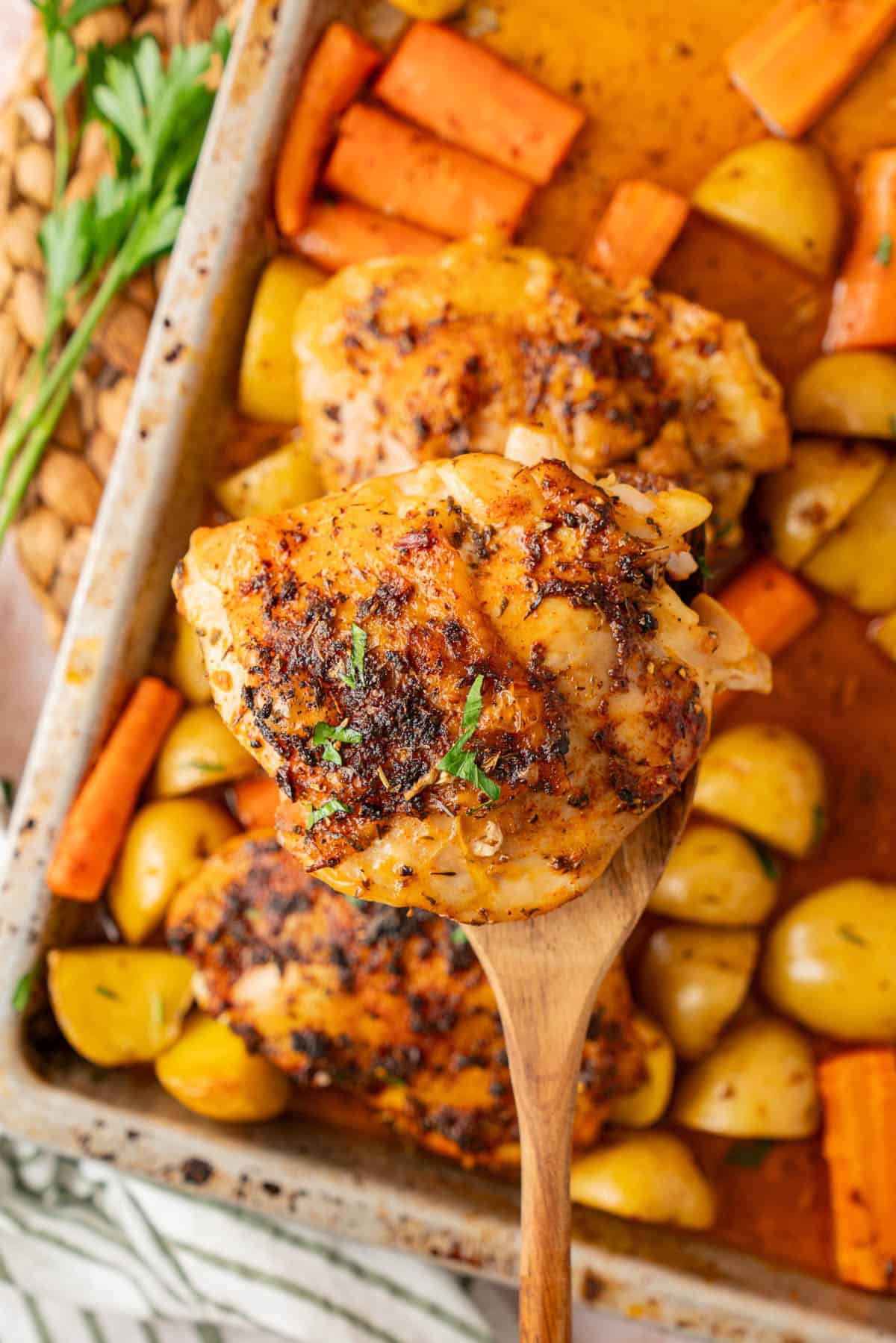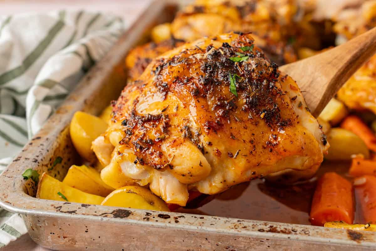 - Chicken thighs: The main event. Use bone in chicken thighs. The bone keeps the meat juicy, and the skin crisps perfectly in the oven. If you use boneless chicken thighs they will more than likely be finished before the potatoes and carrots are tender. You can remove the thighs and tent with foil while the veggies continue cooking.