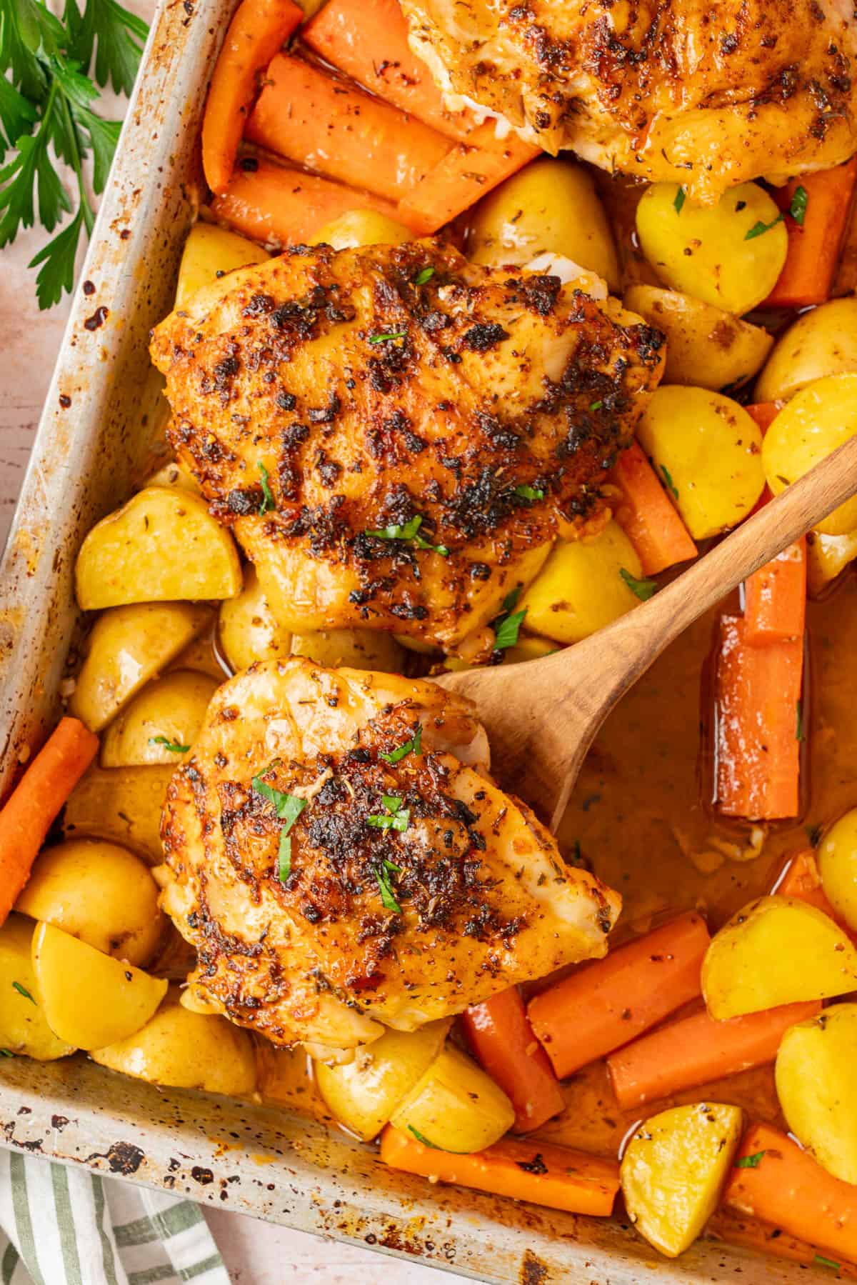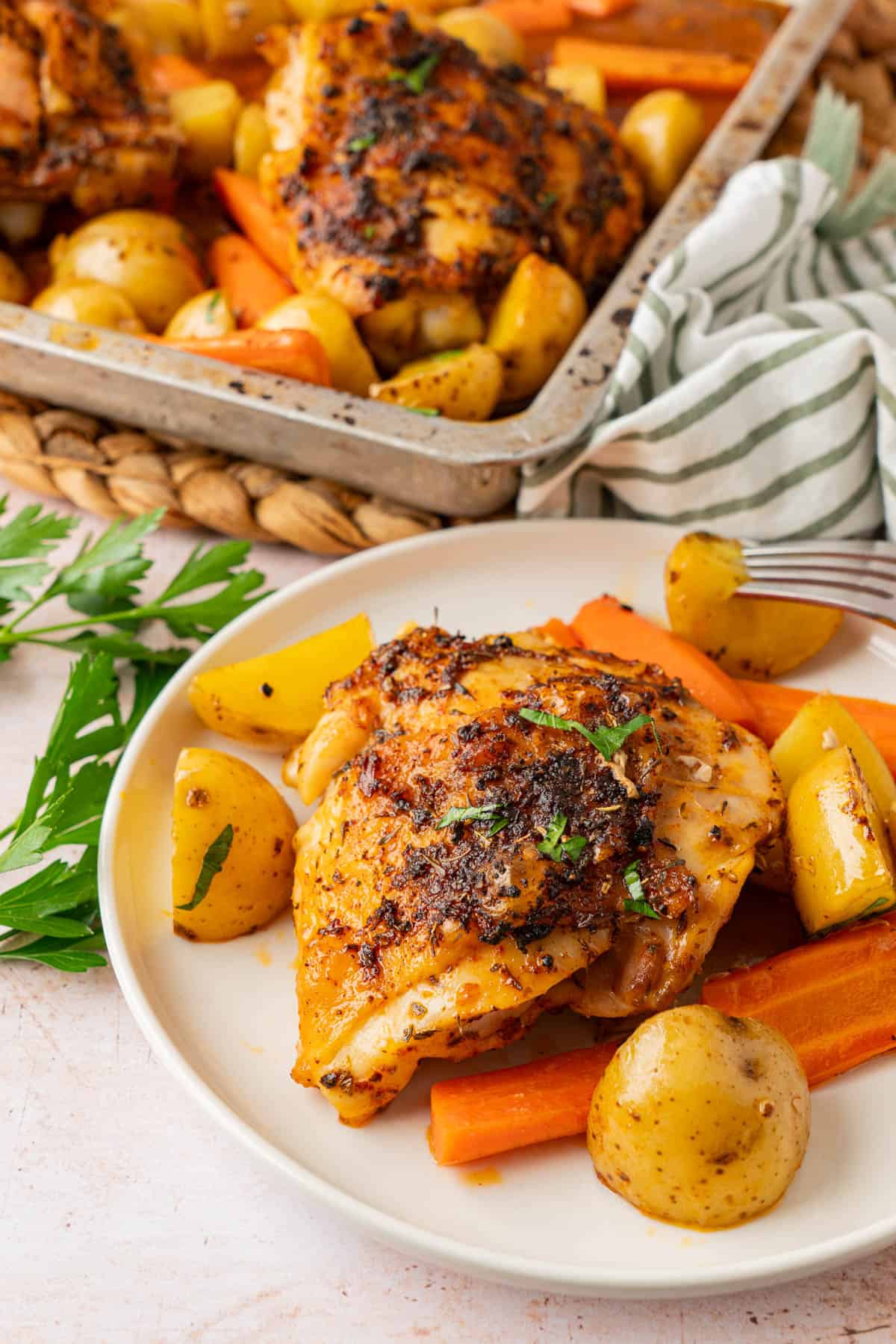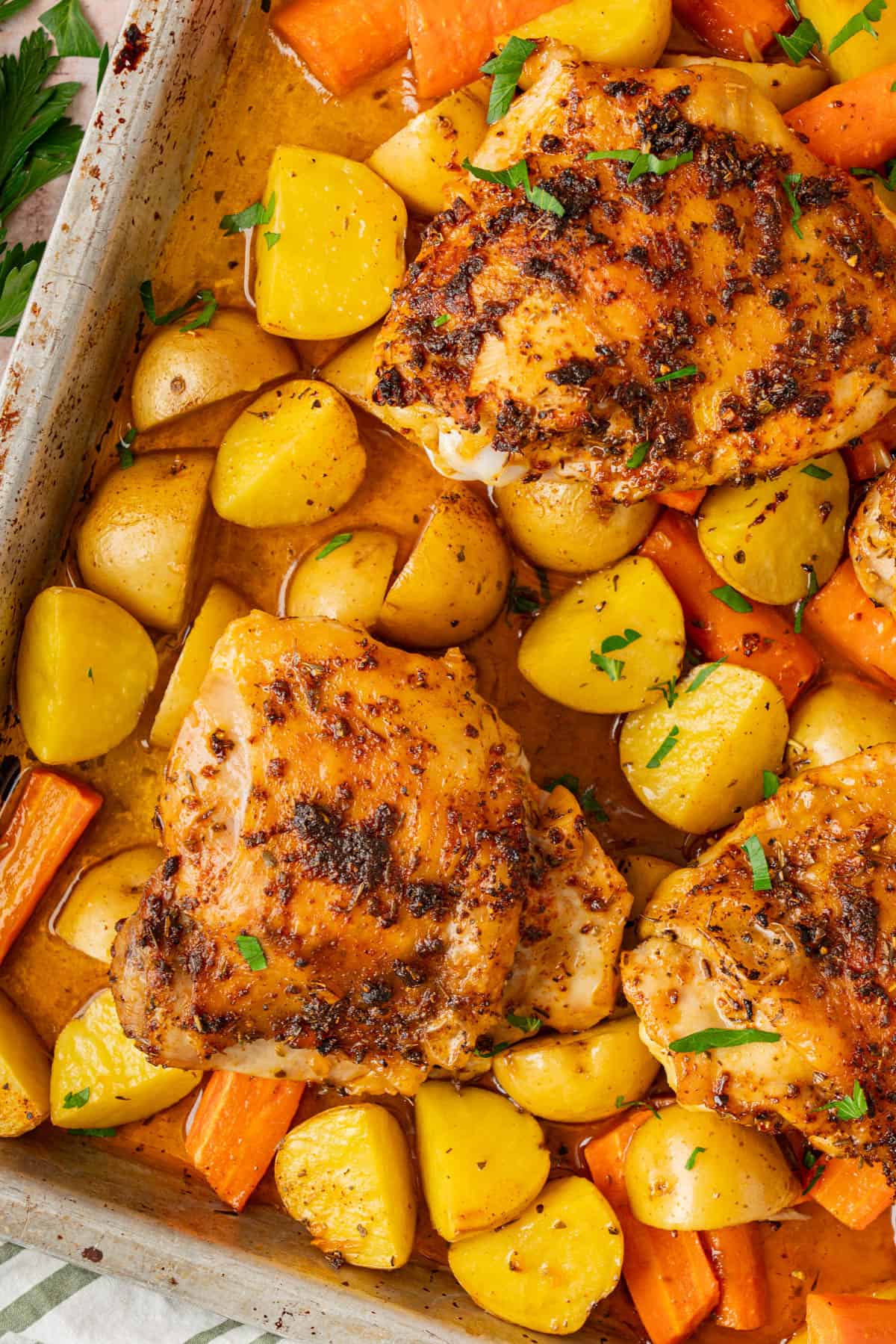 - Chicken thighs: The main event. Use bone in chicken thighs. The bone keeps the meat juicy, and the skin crisps perfectly in the oven. If you use boneless chicken thighs they will more than likely be finished before the potatoes and carrots are tender. You can remove the thighs and tent with foil while the veggies continue cooking.