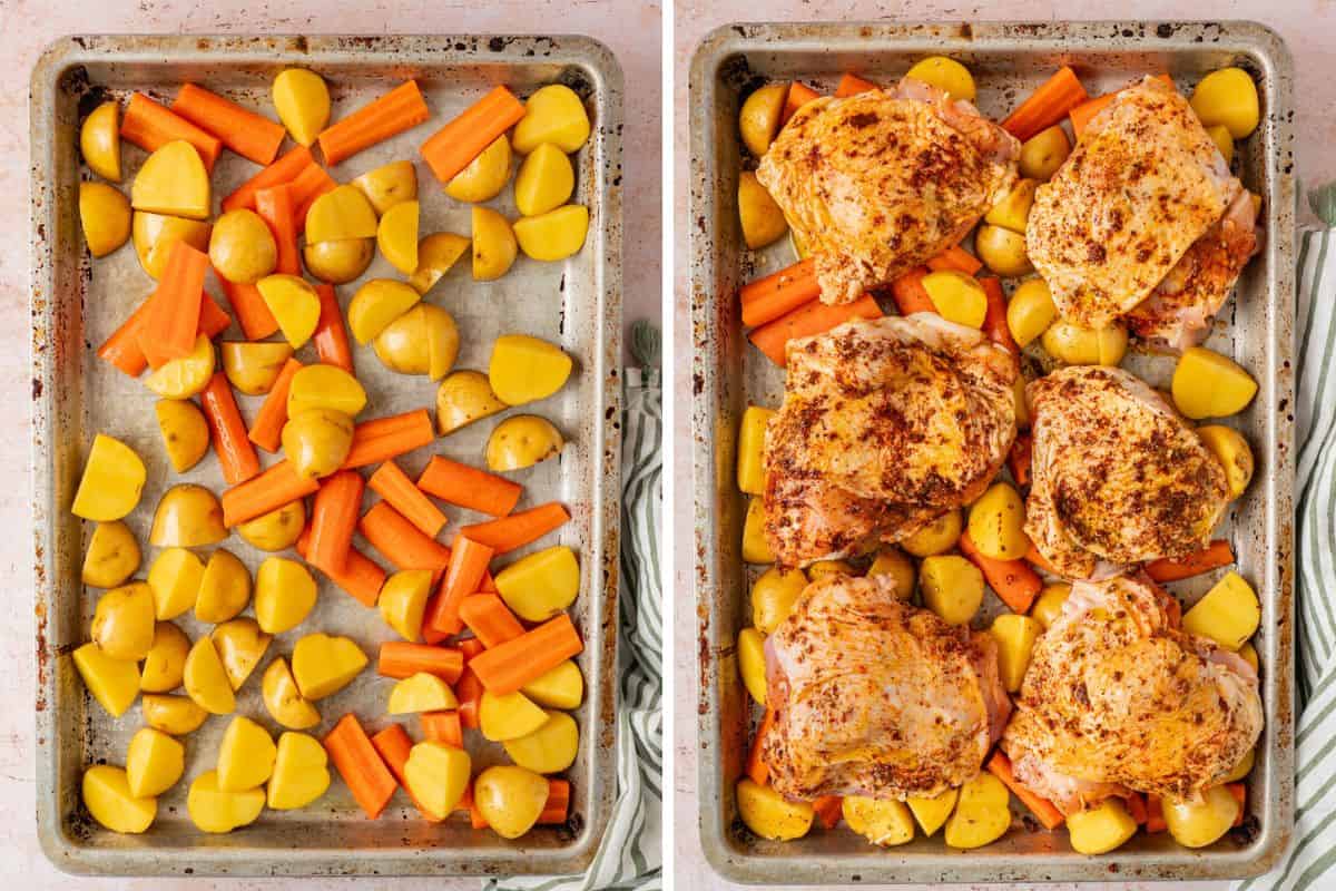 - Pat the chicken thighs down with a paper towel and place on the sheet pan with the potatoes and carrots.