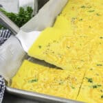 Allow the eggs to cool for a few minutes and then slice into squares and serve. You can easily get 15 servings from the sheet pan or more if you cut the squares smaller.