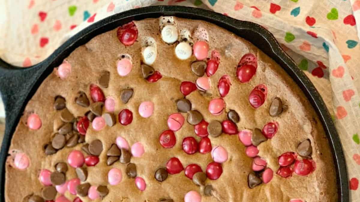Valentine’s Day chocolate chip skillet cookie with pink, red, and brown M&Ms is a creative way to show love and appreciation. Serve it with a scoop of your favorite ice cream and drizzle it with chocolate, caramel, or strawberry syrup.