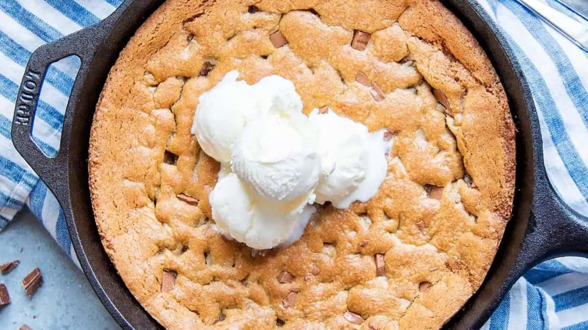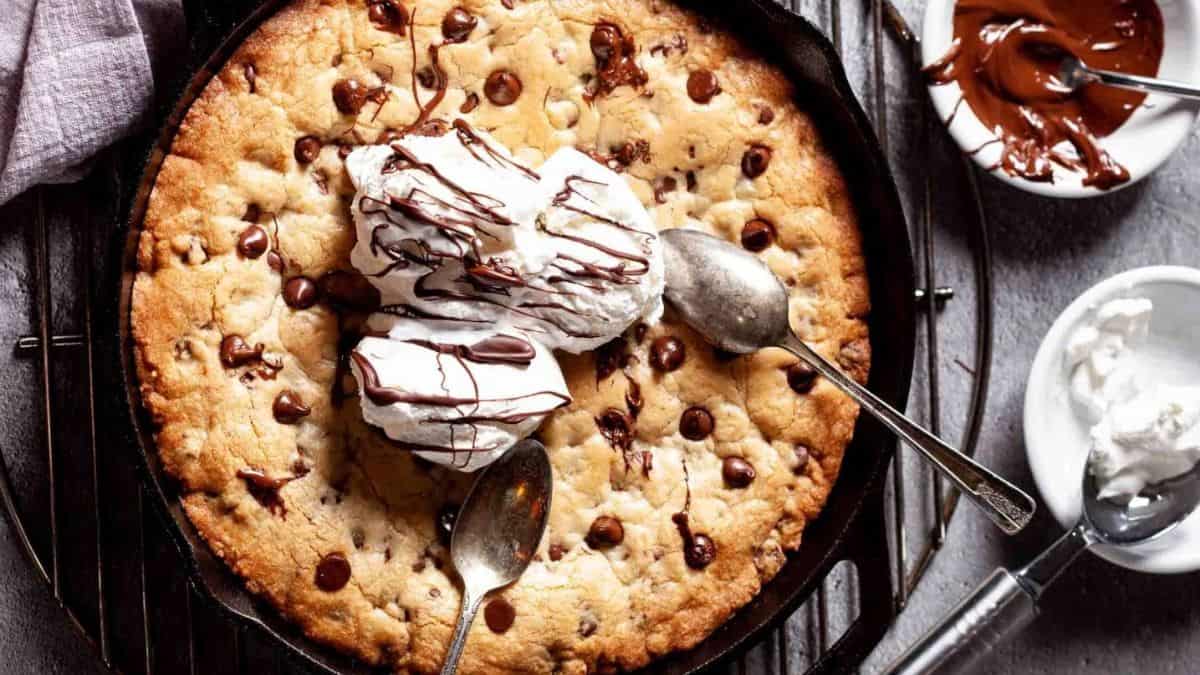 Indulge in the unique texture of skillet chocolate chip cookie cake. Its crispy edges and chewy, gooey, cakey center are a must-try. Serve it classically with vanilla ice cream.