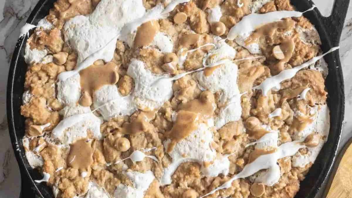 A giant skillet fluffernutter cookie is like marshmallow fluff. It is an excellent dessert idea if you love peanut butter and marshmallows. It is also great to serve with your favorite milk drink.