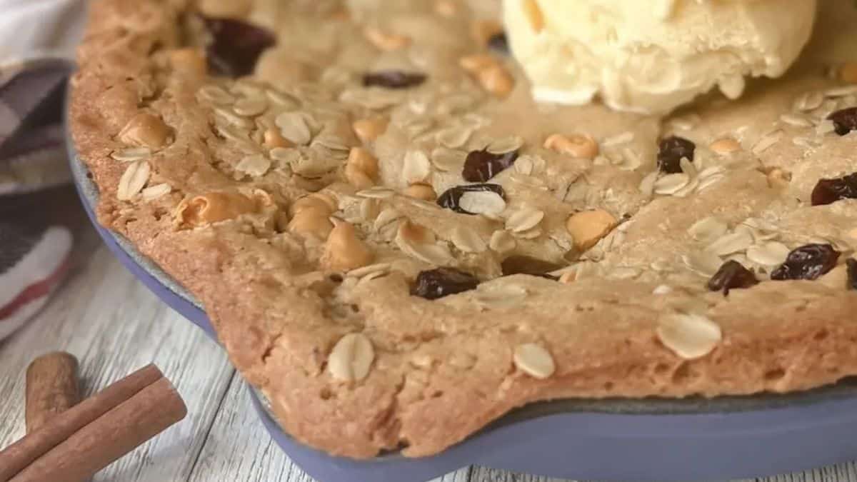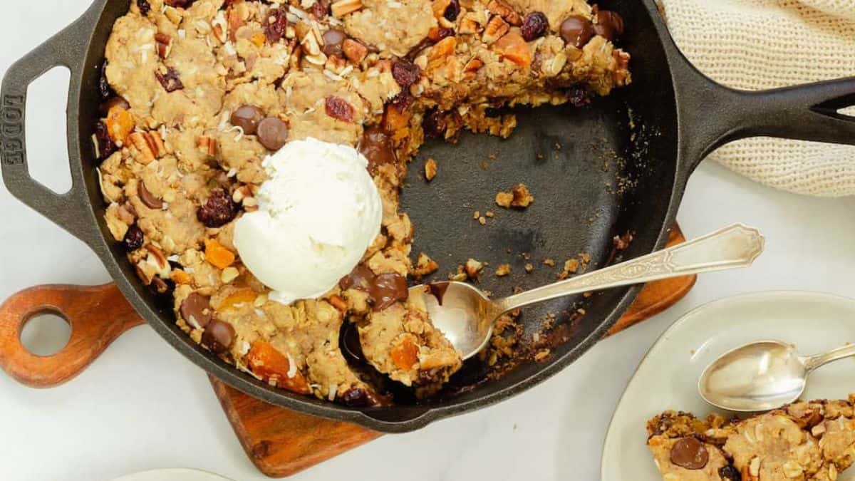 Level up your cookie game by making a giant and nutritious oatmeal, fruit, and nut chocolate skillet cookie. This cookie can be served with your favorite drink as a dessert or snack.