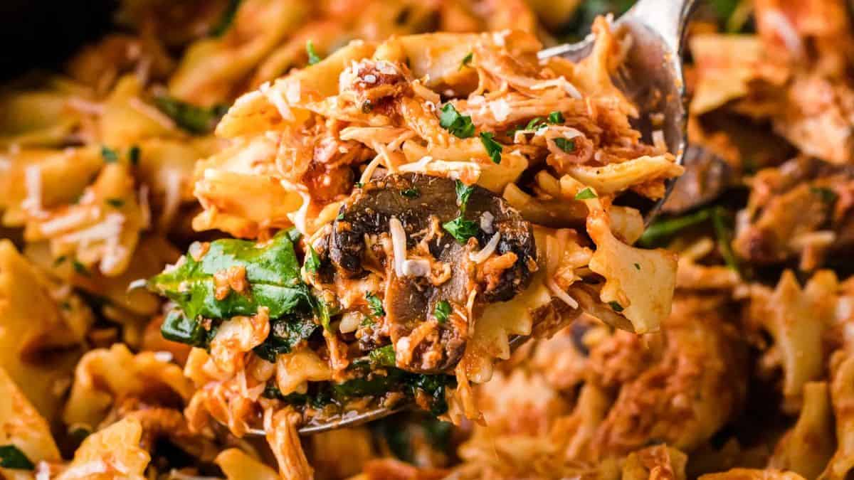 This slow cooker dinner is flavored with a zesty tomato based sauce and loaded with spinach, mushrooms and chicken. This hearty pasta dish is one the whole family will love.