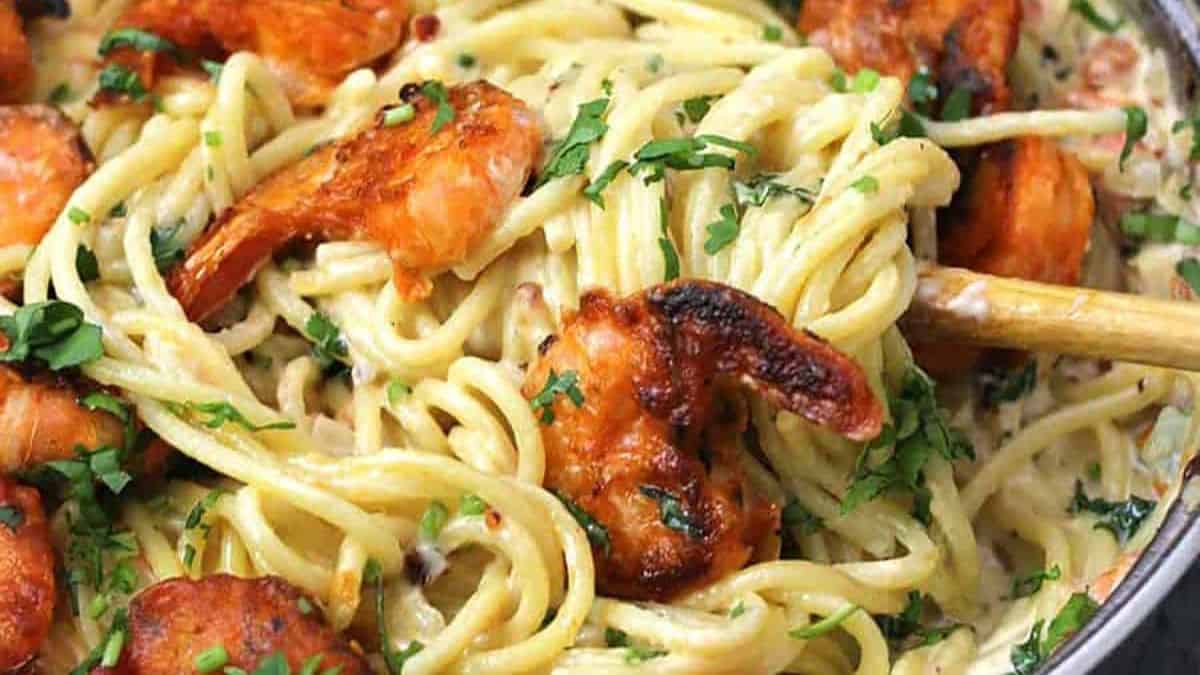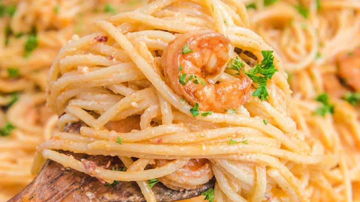 This delicious shrimp pasta dinner comes together in just 30 minutes. It has a sweet and creamy sauce that has a bit of heat from red pepper flakes.