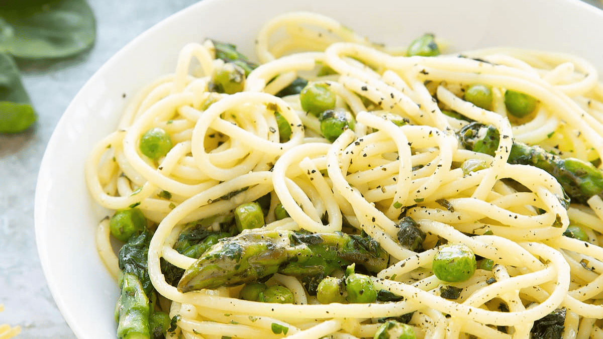 This summer spaghetti is made with earthy spinach and succulent asparagus, lightly sautéed with garlic, finely chopped basil and a little lemon, then tossed through lovely al dente pasta with a sprinkling of Parmesan.