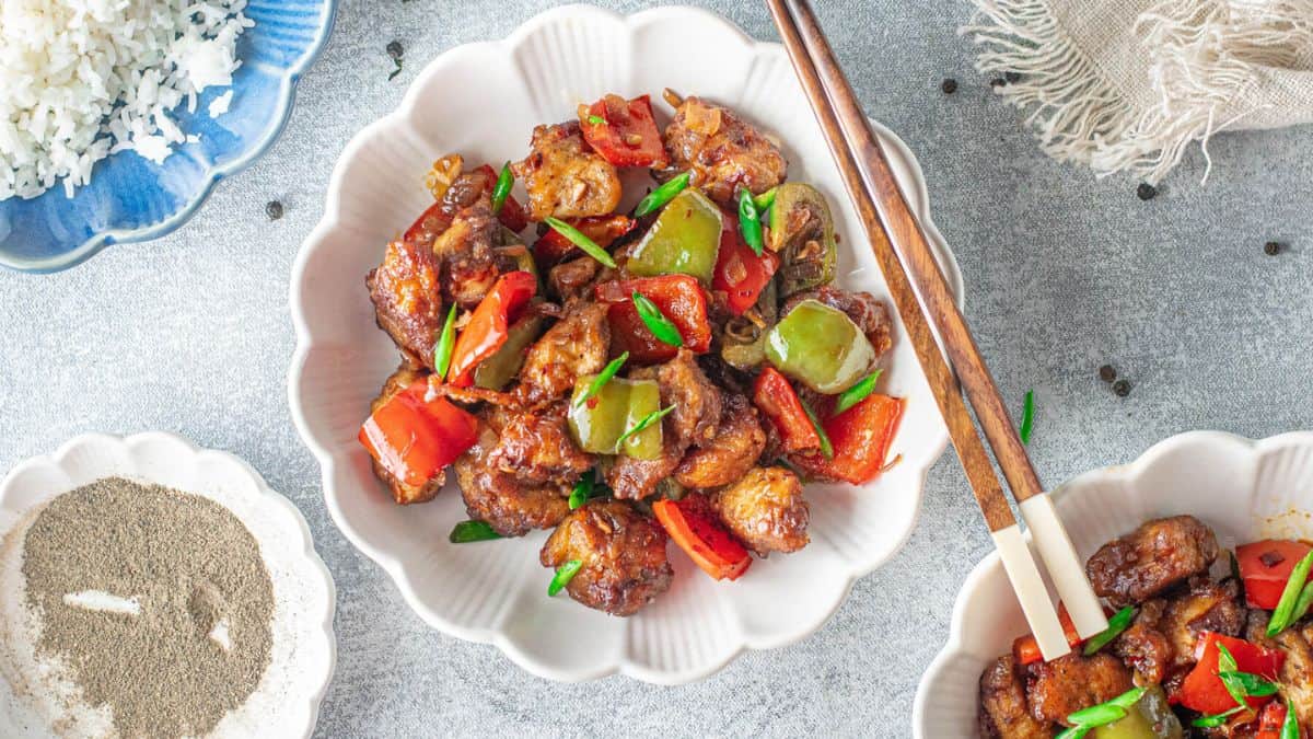 This Black Pepper Chicken Stir Fry makes a quick crowd pleasing weeknight dinner. The crispy chicken and colorful vegetables are tossed in a fiery stir fry sauce then served over steamed rice.