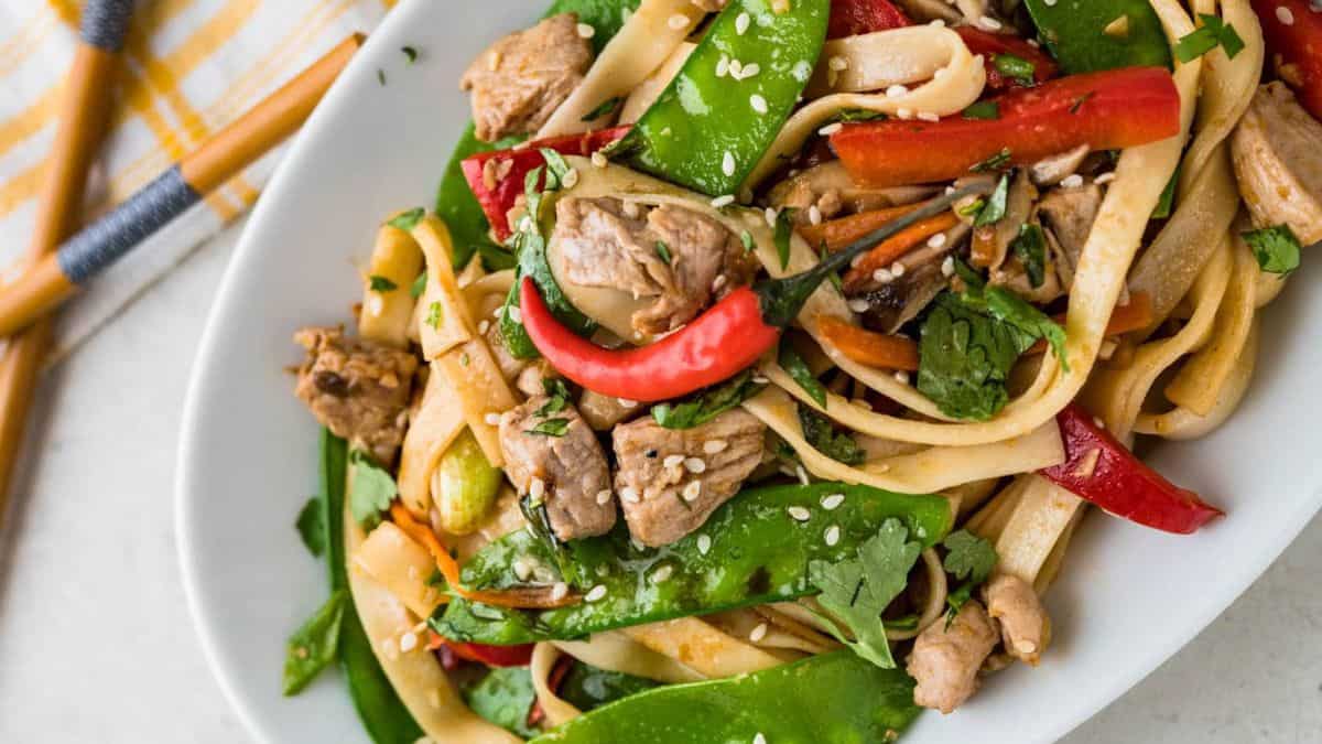 Skip takeout and make your own pork lo-mein at home with this simple recipe using pork tenderloin, snow peas and water chestnuts. The sauce makes this dish sing.
