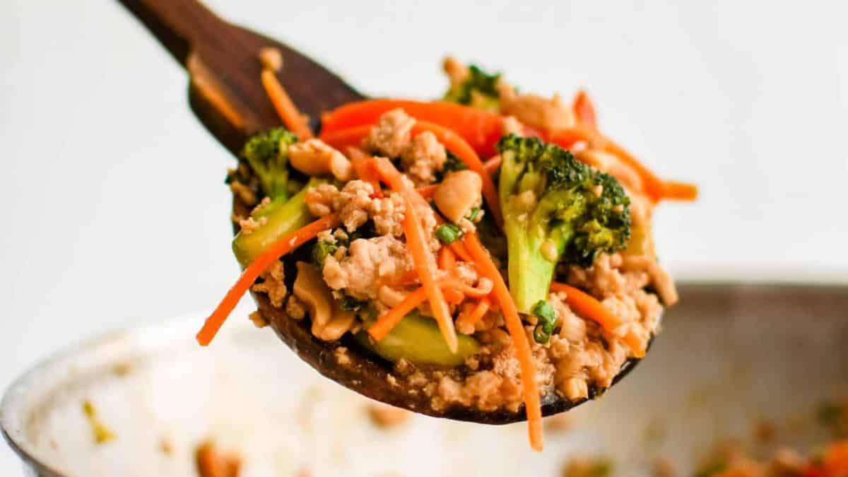 This healthy stir fry is made with ground chicken, veggies and crunchy cashews for a quick weeknight dinner recipe. Complete the meal by serving along side rice.