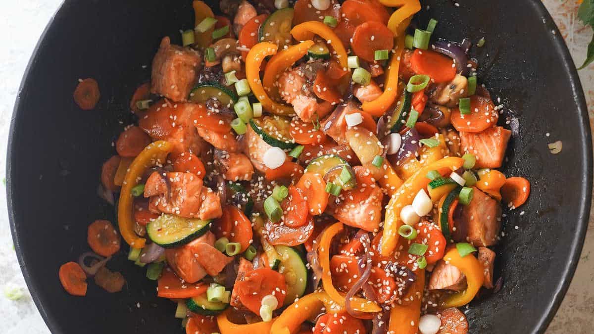 This salmon stir fry has delicious Asian flavors from the sauce plus crisp stir fried vegetables for a dinner that is flavorful and nutritious.