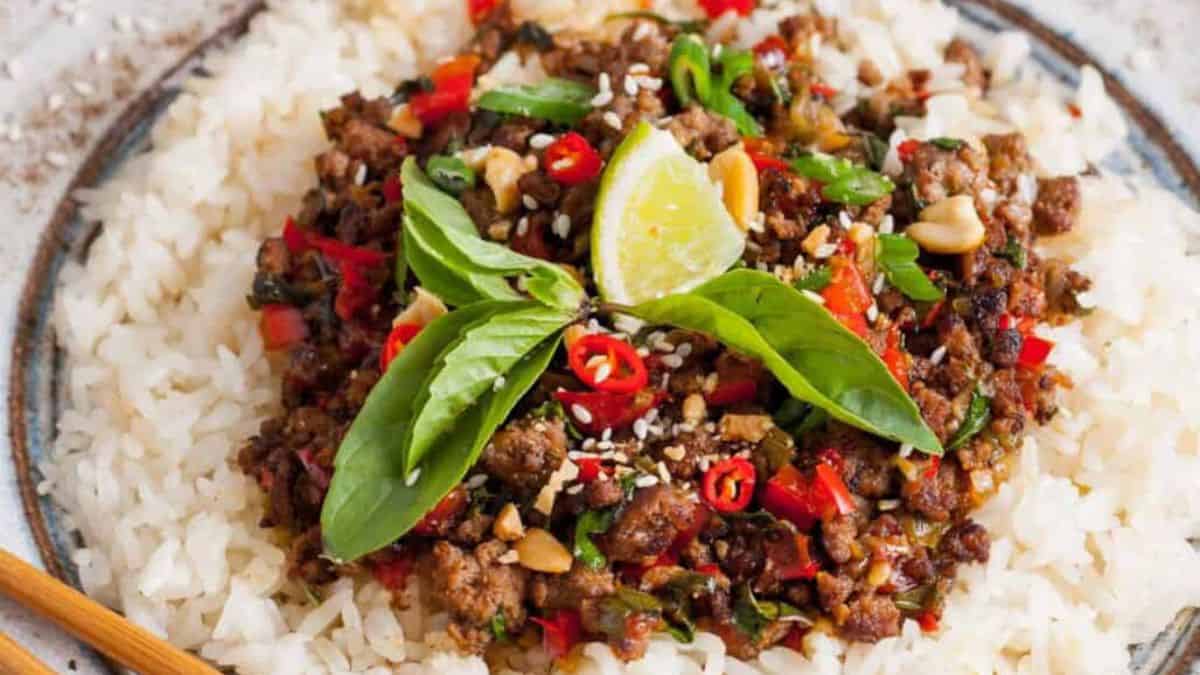 With this recipe, you can make the Thai staple spicy beef stir fry at a restaurant level at home. It is a 30-minute dinner bringing to ground meat aromas and flavors of Asia with basil, chili peppers, and fish sauce.