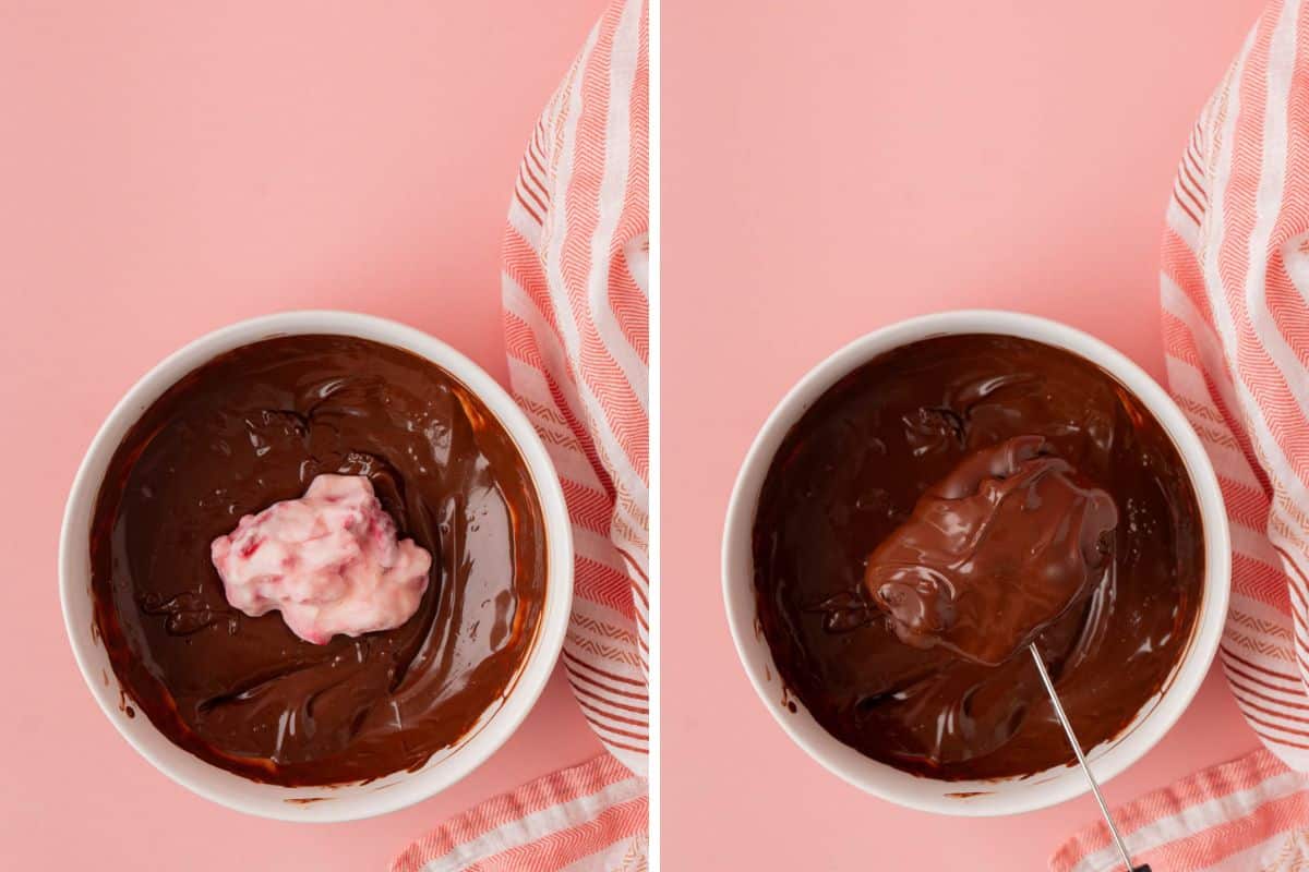 - Work quickly when dipping since the bites soften fast outside the freezer.