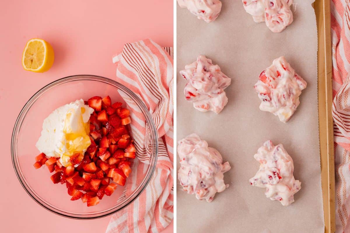 - Place small spoonfuls of the strawberry yogurt mixture onto the prepared cookie sheet. You should get about 12 bites. Place in freezer to firm up for 1-2 hours.